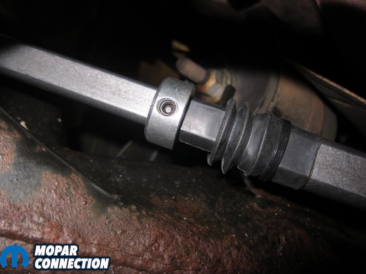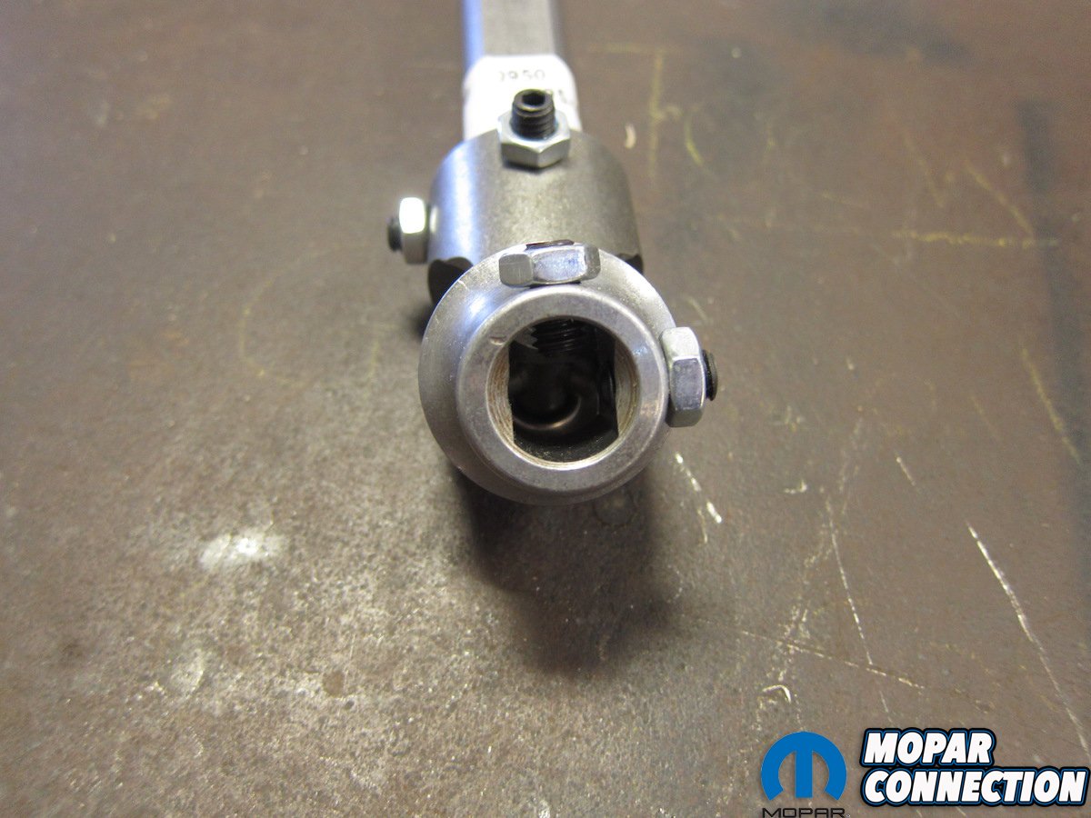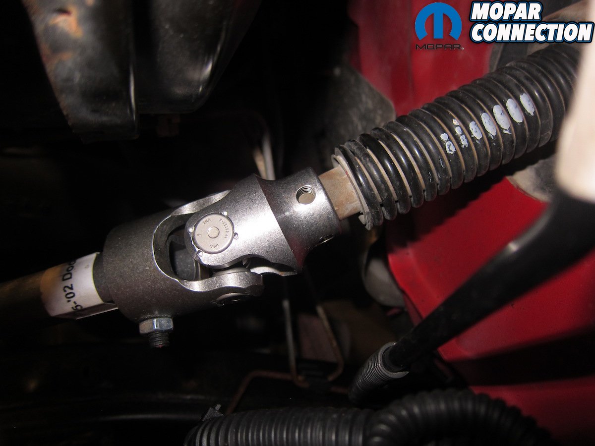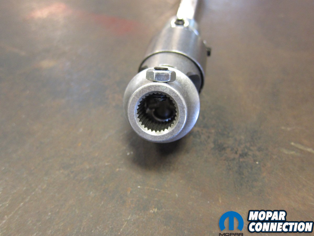 The last step was to position a steel stop collar on the lower telescoping shaft. Similar to what Chrysler did as part of an added safety feature in early trucks, this collar is meant to prevent full disengagement of the steering shaft in the event of a component failure. We slid it up to the bottom of the boot and tightened the final screw.