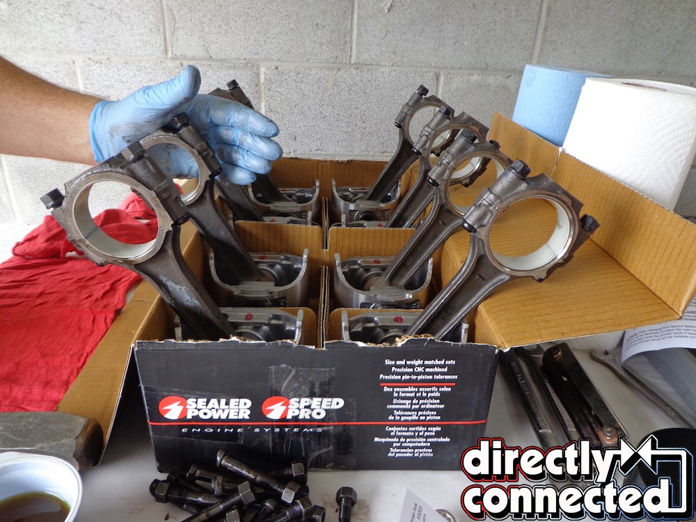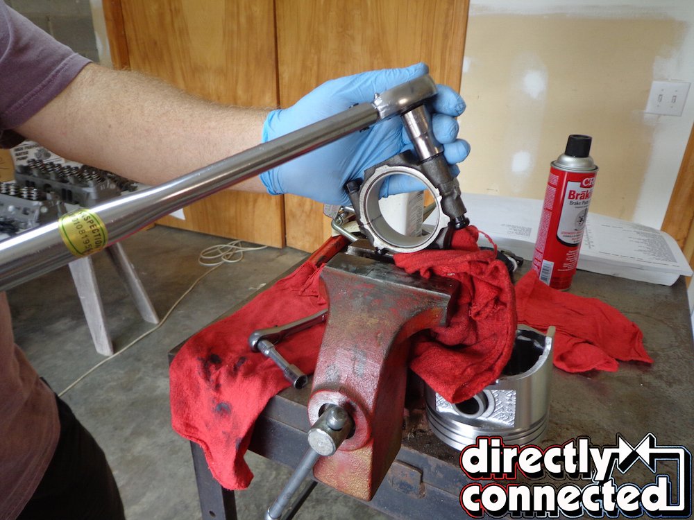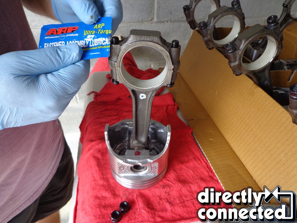 We like to get all the piston assemblies in correct order and orientation in the piston box to help with proper assembly order. In order to seat the new ARP rod bolts, assemble the rods and caps and coat with the ARP assembly lube and torque to the recommended amount that comes from the manufacturer. It is will different than the torques spec in the Factory Service Manual. If you are using your original bolts follow the manuals specs. Reminder: always torque everything to specifications!