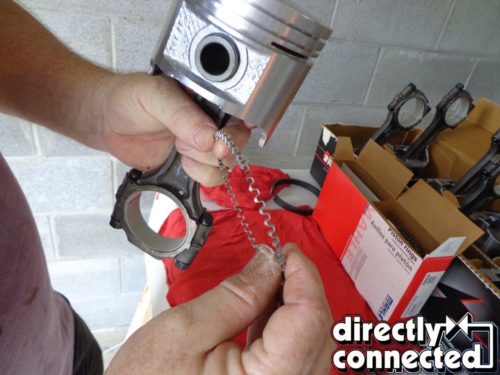 Above left: Following the instructions with the ring kit place the oil ring in first. Caption combined with below image. Above center: Following the instructions with the ring kit place the oil ring in first. Next place the upper and lower oil ring retainers making sure to stager the gaps according to the instructions. Above right: Next install the compression rings per instructions making sure to get the ring in properly with the correct beveled edge upward.