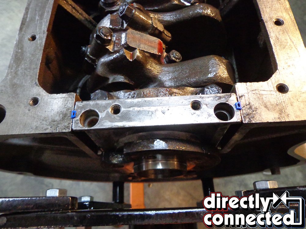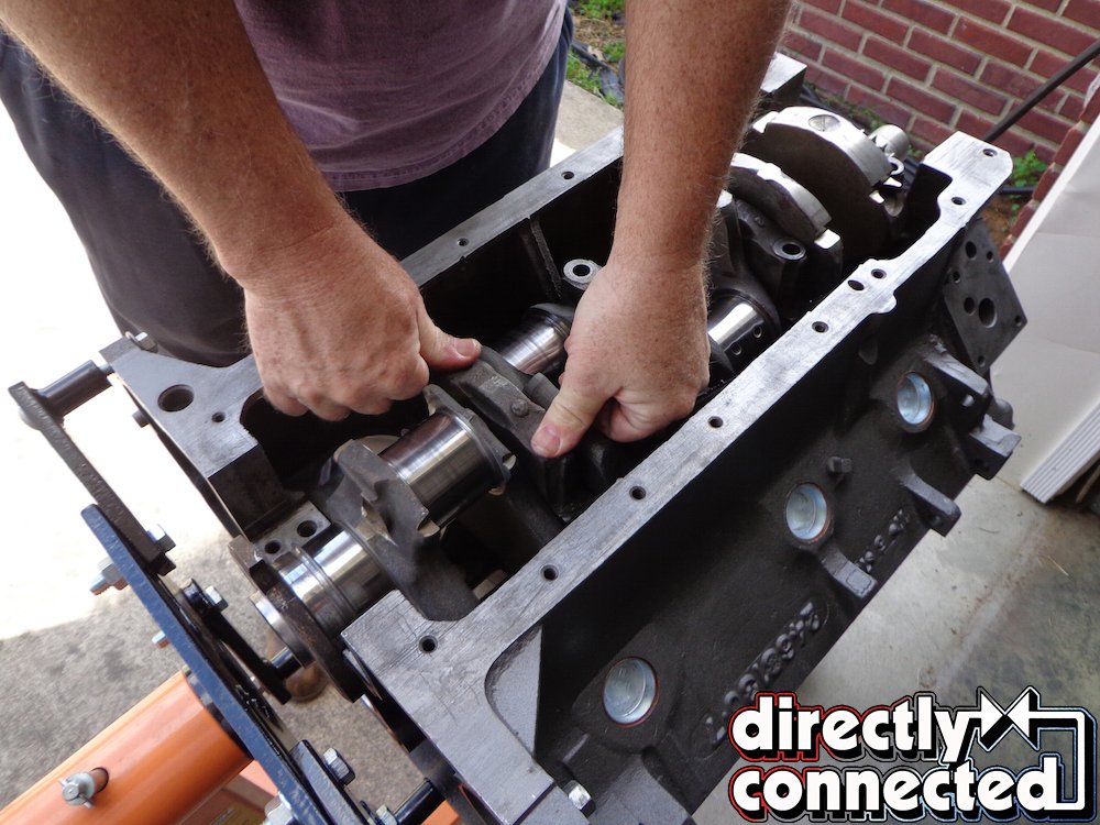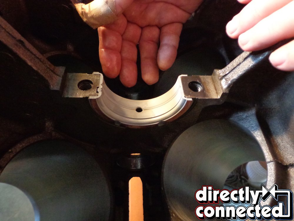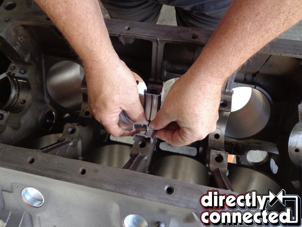 Above left: Drop the crank in and rotate to make sure it spins freely and check to make sure there aren’t any catches or any drag while turning the crank. Above center: Begin to install each main bearing. They are numbered 1 – 5 with number one at the front of the engine so there shouldn’t be any problem getting them in the right order. Above right: They are a tight fit so make sure to line them up evenly so that one side is not in farther than the other.