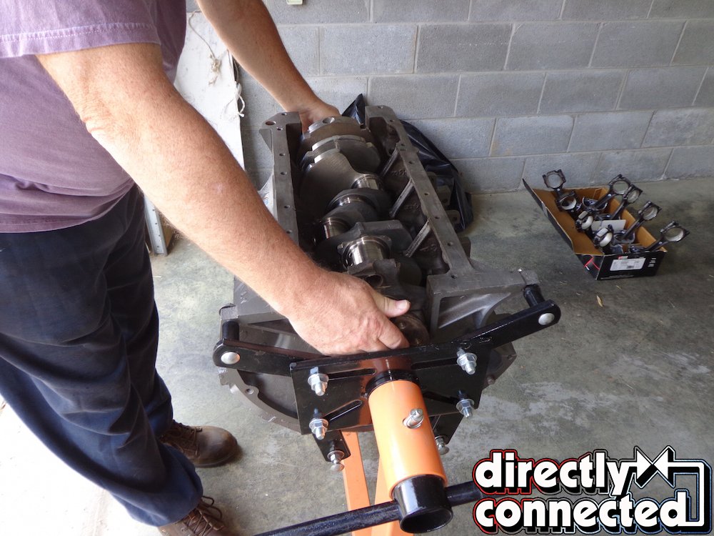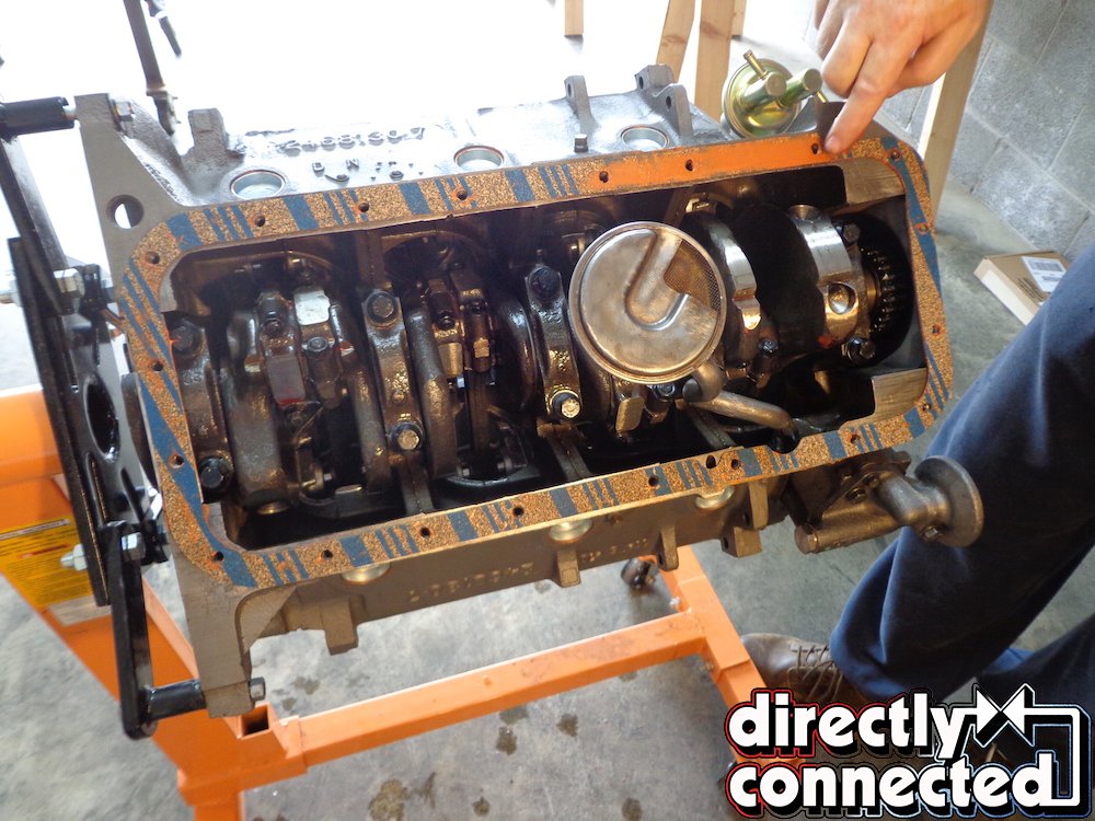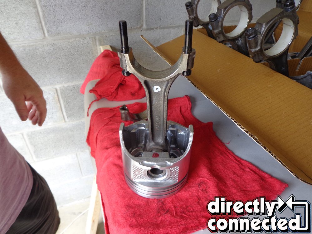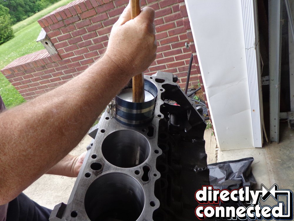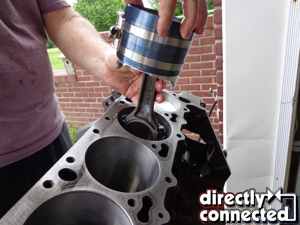 Turn the crank so that number one crank journal is fully at the lowest point from the block. Dip the piston in a bowl of oil making sure all the rings are immersed. Using a ring compressor tighten it on the piston. Insert piston and guide the rod keeping it from scratching the cylinder wall. Once in place tap with medium force the top of the piston until it is fully in the cylinder hole. Then guide the rod onto the crank journal while continuing to tap the piston in from the top. Put the rod cap on and tighten the rod nuts leaving them only snug.