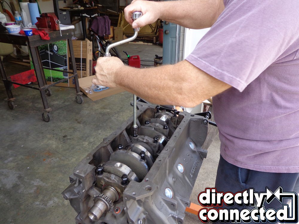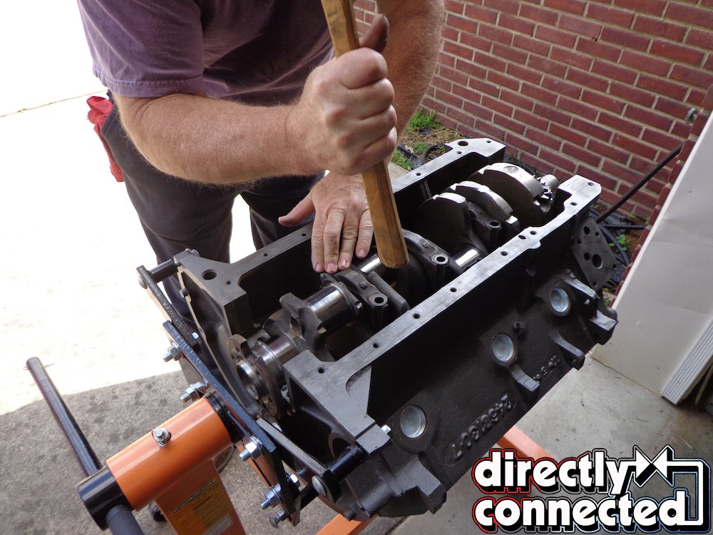 Above left: Sometimes you must tap them in with a hammer handle to make sure they fit properly. Do not use anything metal since it may damage the main bearing caps. Above right: Snug down all the bolts on the crankshaft in order. Again make sure nothing is dragging and the crank turns smoothly. Torque all main bolts to specifications and again make sure the crankshaft turns freely.
