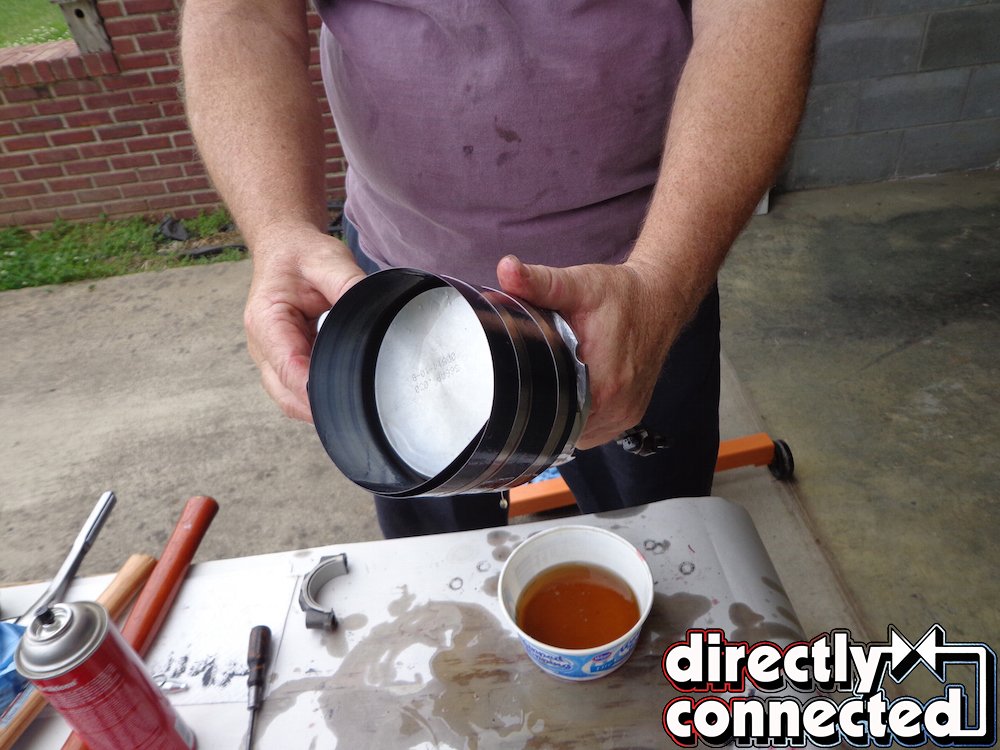 Above left: Before inserting the numbered pistons into each corresponding numbered hole, dip the piston in the assembly oil. This ensures all of the rings are lubricated before assemble. Above right: Take the spring compressor and wrap it around the piston and make sure the rings have the proper staggered positions according to the instructions that came with the rings.