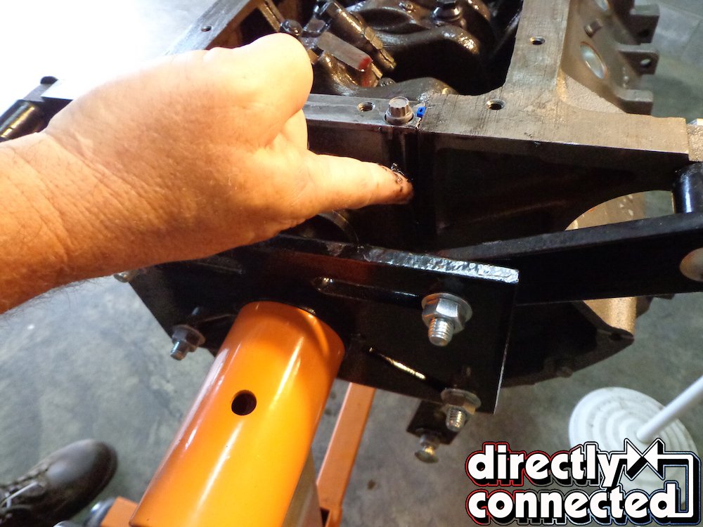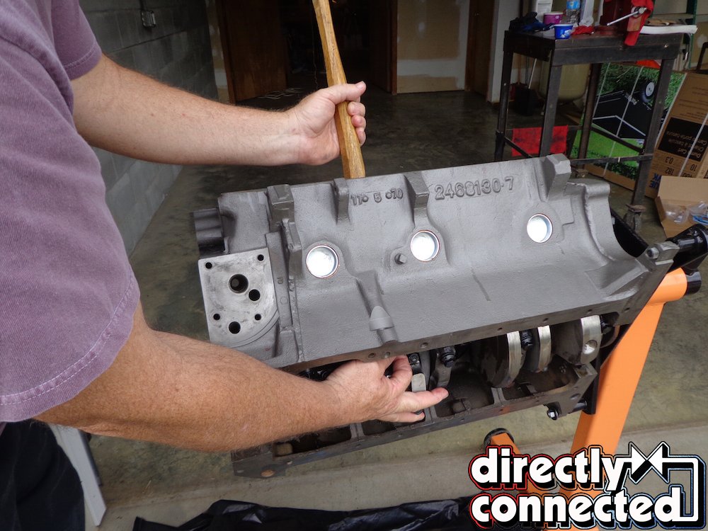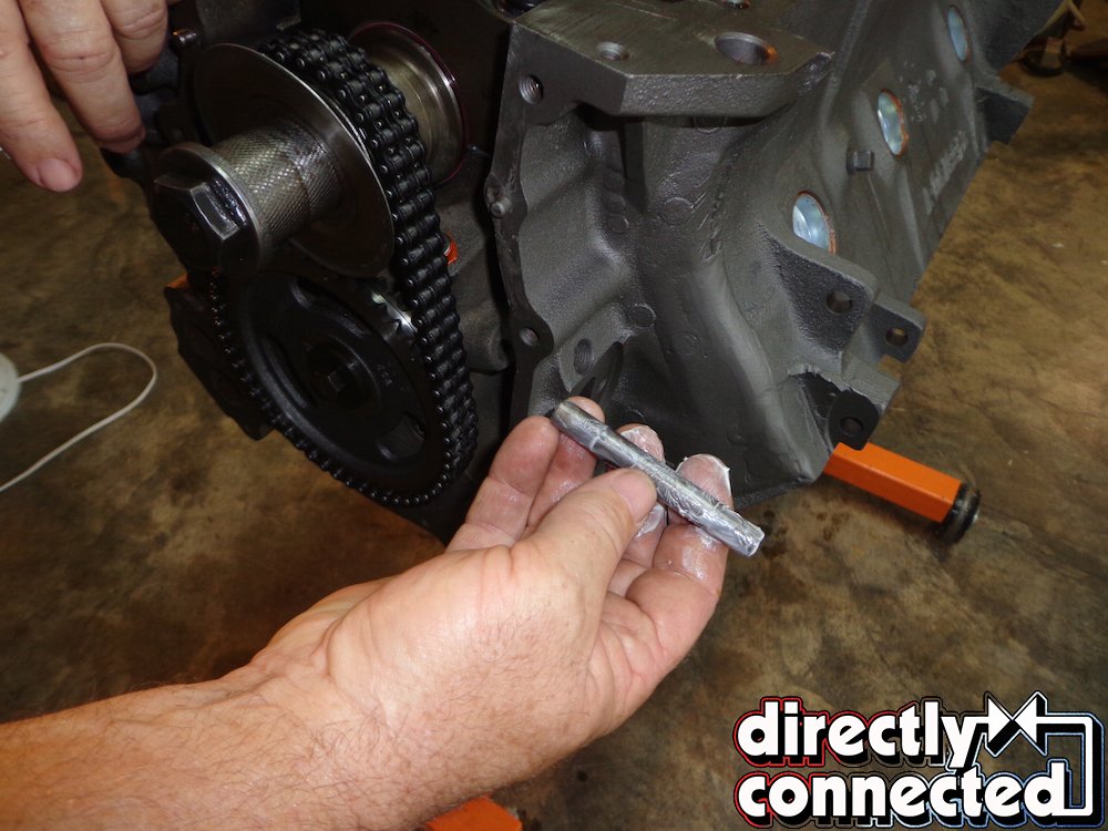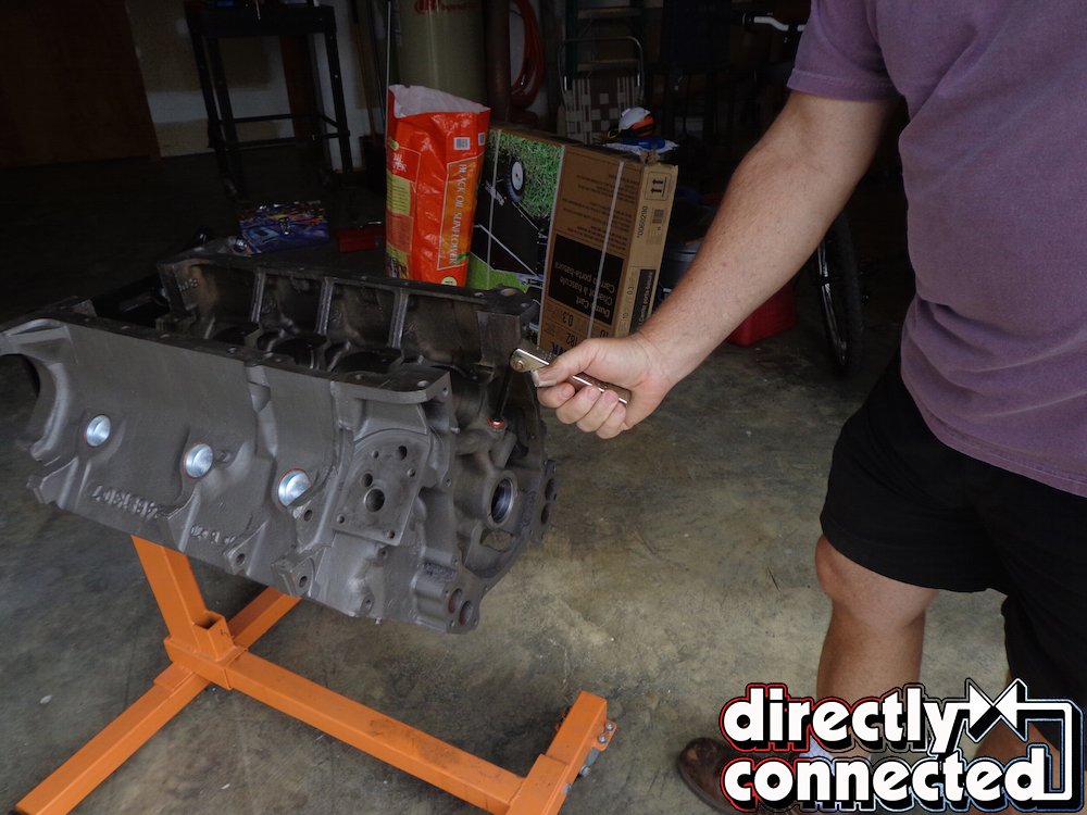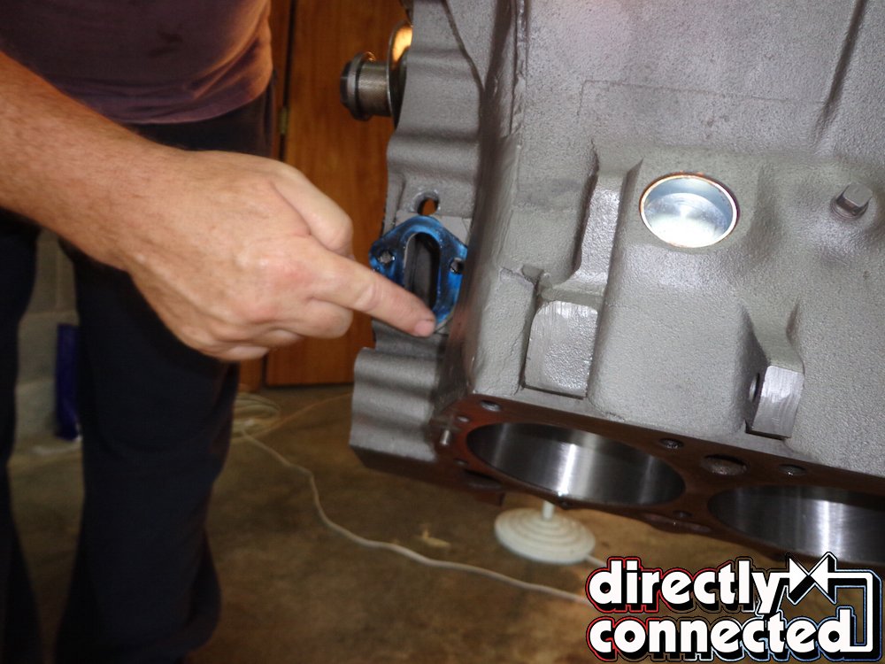 Check the block and make sure all of the oil channel plugs are in place. Usually the machine shop will install these, but never assume anything when building you engine. Double-check everything. On this block one of the main plugs was left off. Without it there will be low if any oil pressure. Use Red High temp RTV to seal the threads and install.
