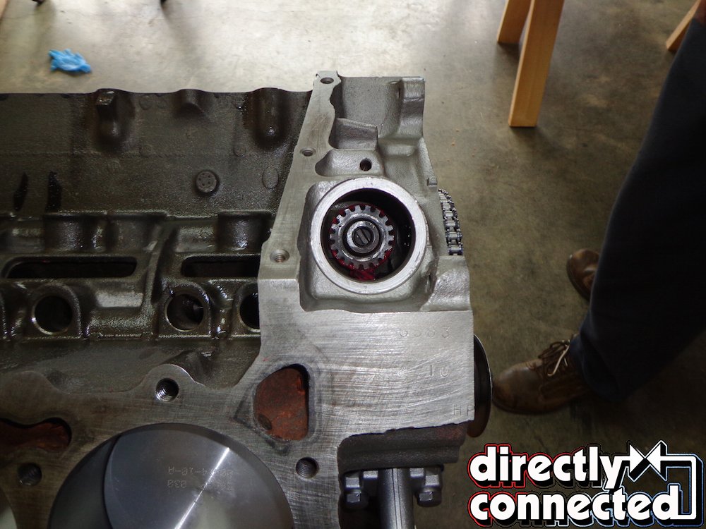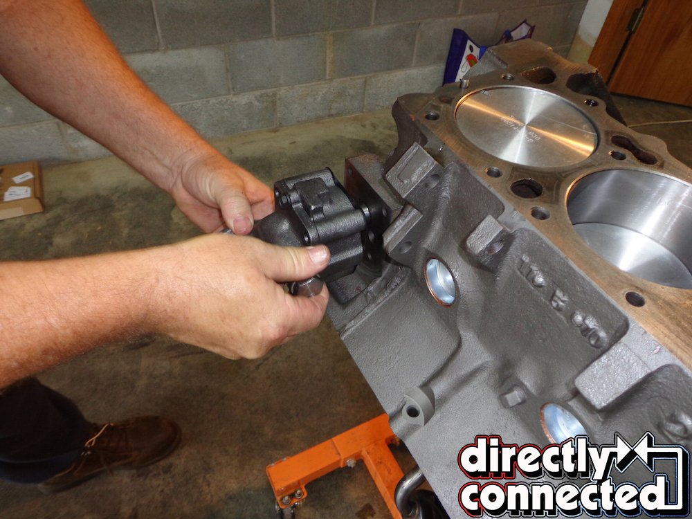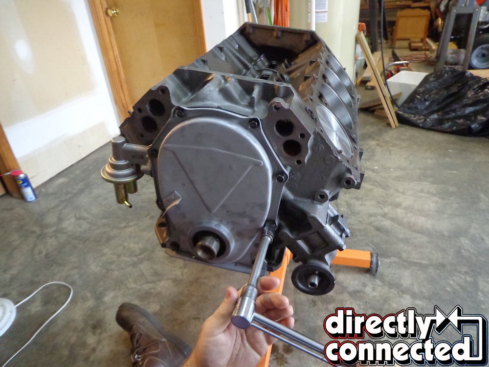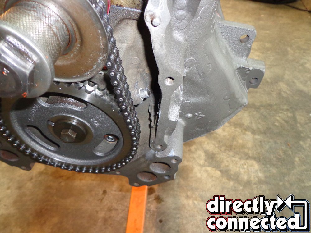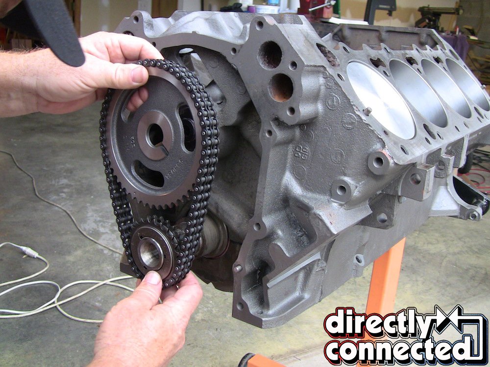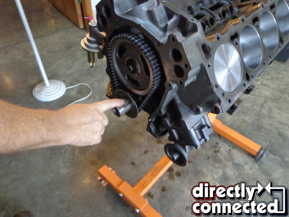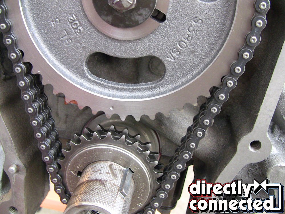 Install the stock fuel pump with the pump rod in place. Notice the correct headed bolts. Using new gaskets and RTV seal and attach the oil pump, we suggest you replace the stock one with a high volume one. It will look stock but provide more oil flow to your engine. Do not torque until you have installed the distributor drive shaft. Position the crank so that the number one piston in at TDC (top dead center) and the two “O” or dots line up on the upper and lower timing chain sprockets.