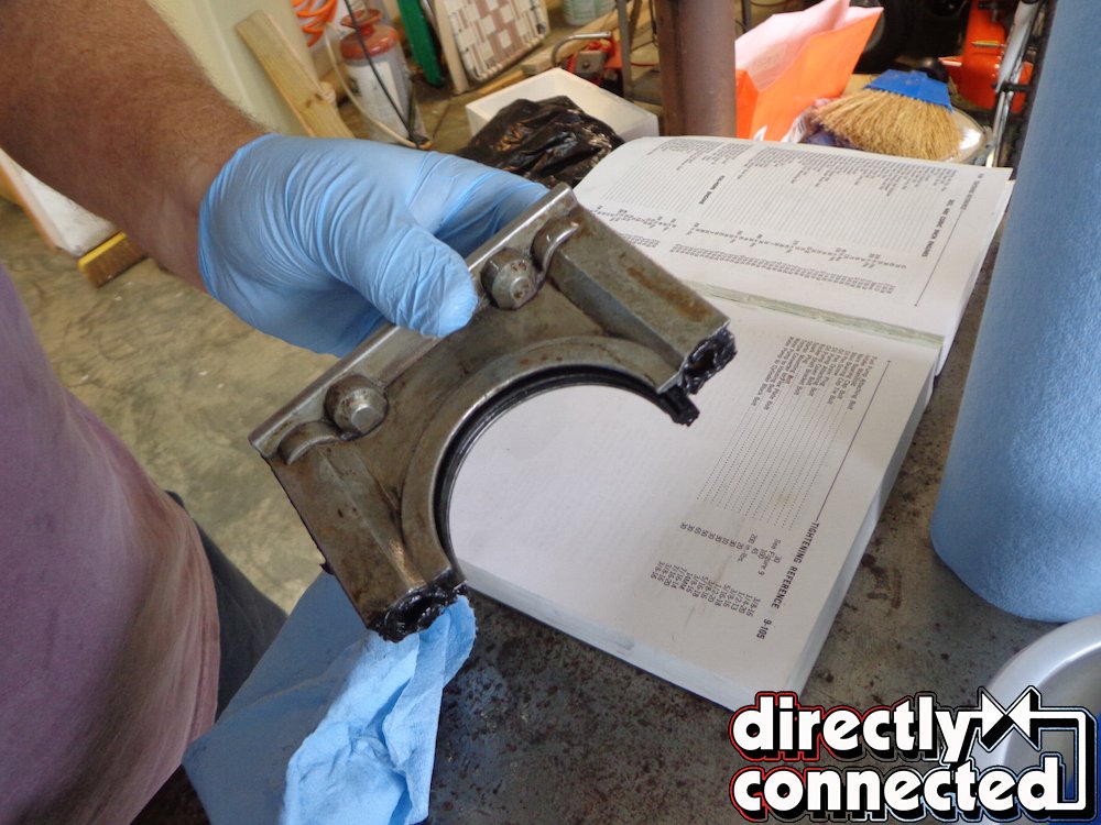 Clean the rods with spray cleaner. Install the rod bearing into the rod assemblies. There are different edges on the bearings. Make sure the more beveled side goes toward the front of the engine on number 1, 3, 5, 7 rod and towards the rear of the engine on number 2, 4, 6, 8 rods. That leaves the less beveled side mating to the rod that shares the same crank journal.