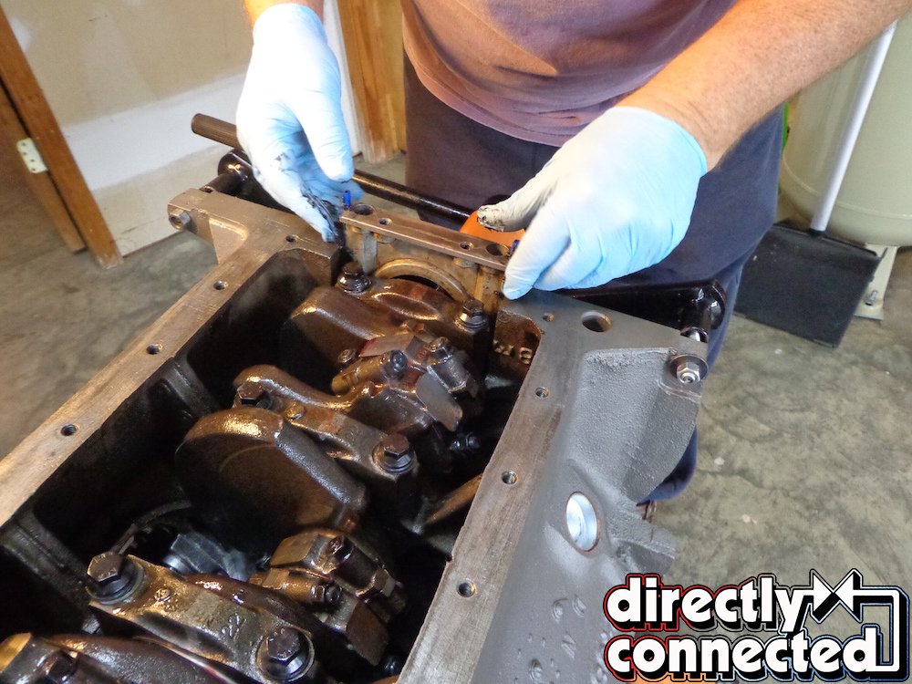 Put the crankshaft bolt in place so you can easily rotate the crank. Give it a few turns to make sure it turns freely. Rotate block up to about a 45-degree angle. Wipe the engine cylinder walls with cleaner and then with a clean rag soaked in oil. Begin with number one rod assembly. Double check the position of the rings based on the factory service manual instructions. Apply assembly lube to the rod bearings. The number one cylinder is on the driver’s side front of engine.