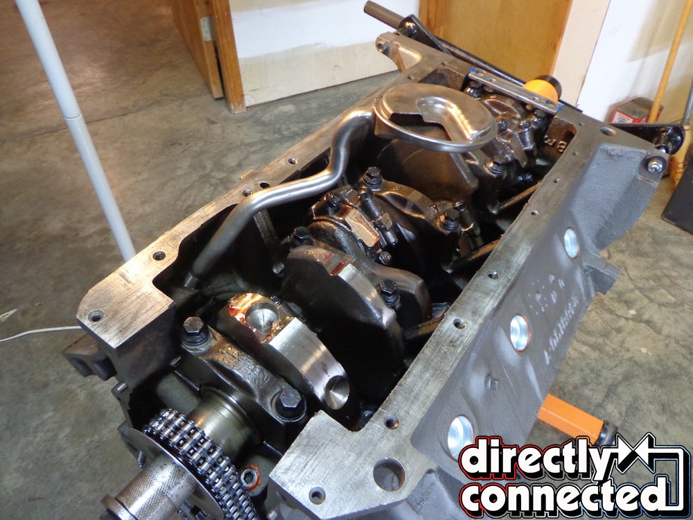 Now that the timing chain cover is installed, rotate the engine to the bottom up position, install the oil pick up tube. Be careful getting it started because it is easy to cross thread the unit. Using a pipe wrench tighten it until it clears the oil pan with about ¼-to-½-inch clearance between the pickup and the pan. Check for clearance and fit of the windage tray also.