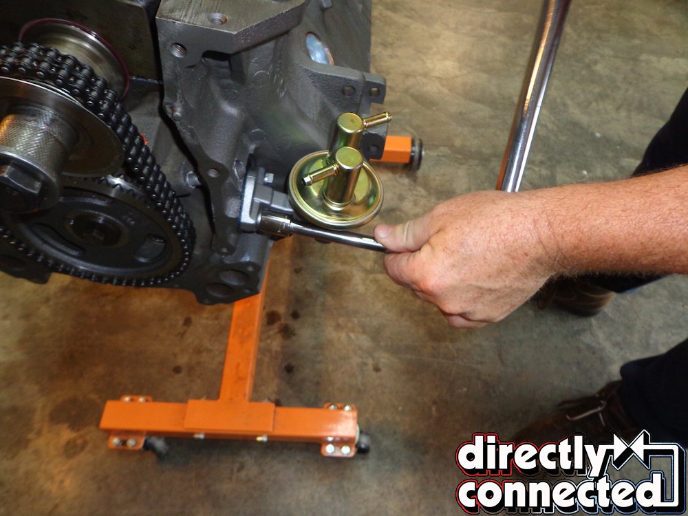 Above left: Position the fuel pump into the block making sure the pump lever is seated correctly against the pump rod. Above middle: You will feel some slight resistance from the pump lever when it is in the correct position. Install the bolts and torque to specifications. Above right: Put silicone on the fuel pump push rod access plug and install tight.