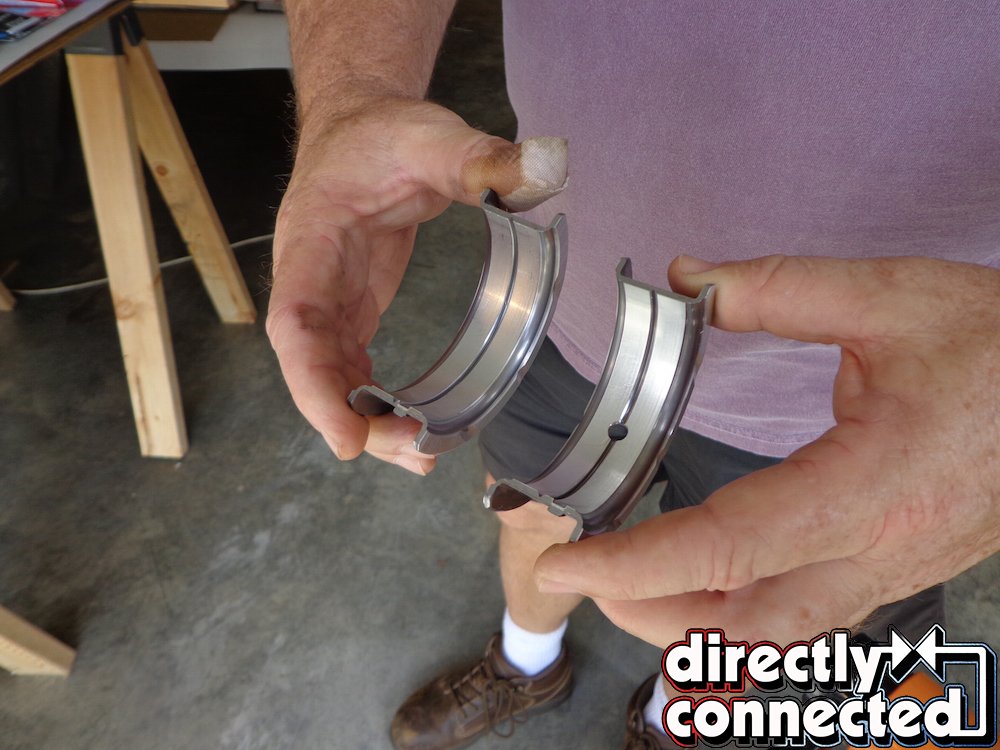 Above left: Begin to assemble the rod bearings paying careful attention to the chamfer on the edge of the bearing. The flat side of the bearing needs to be installed in the rod where #1 and #2 rods meet. The chamfered side of the bearing will then match the chamfer on the crank journal. This is true for the rest of the rods. Above right: Pre-lube all of the rod bushings in prep for assembly into the block.
