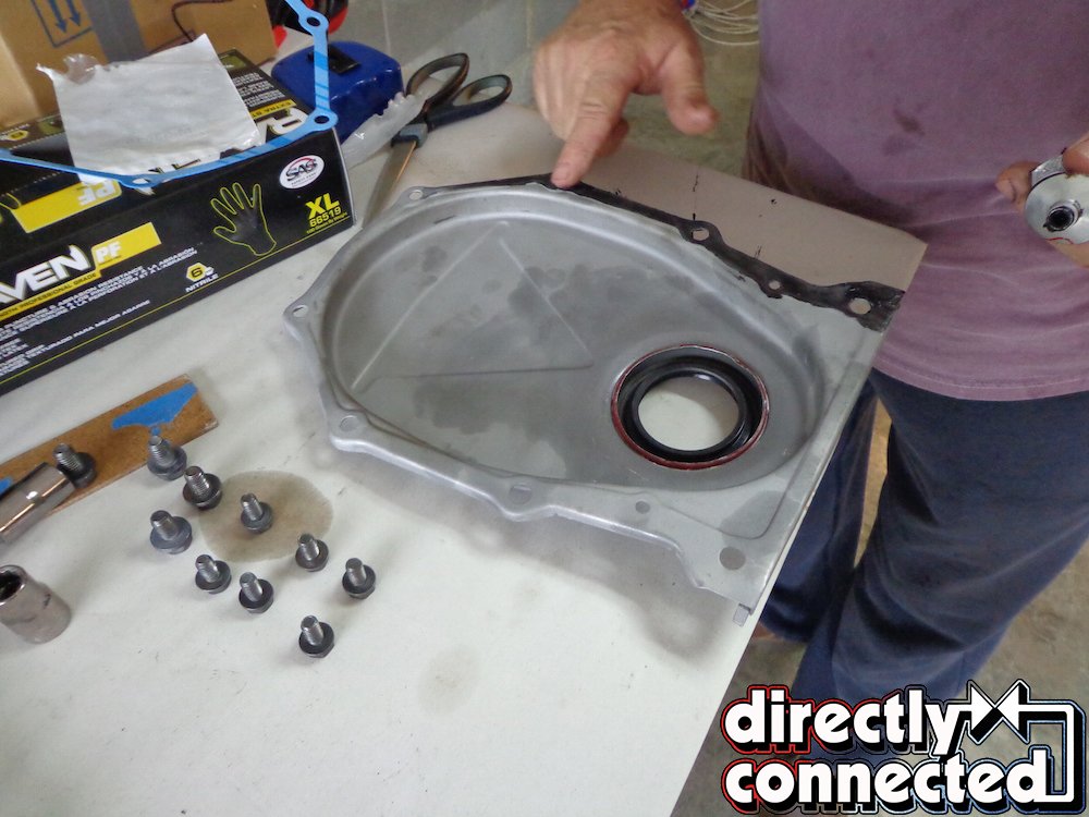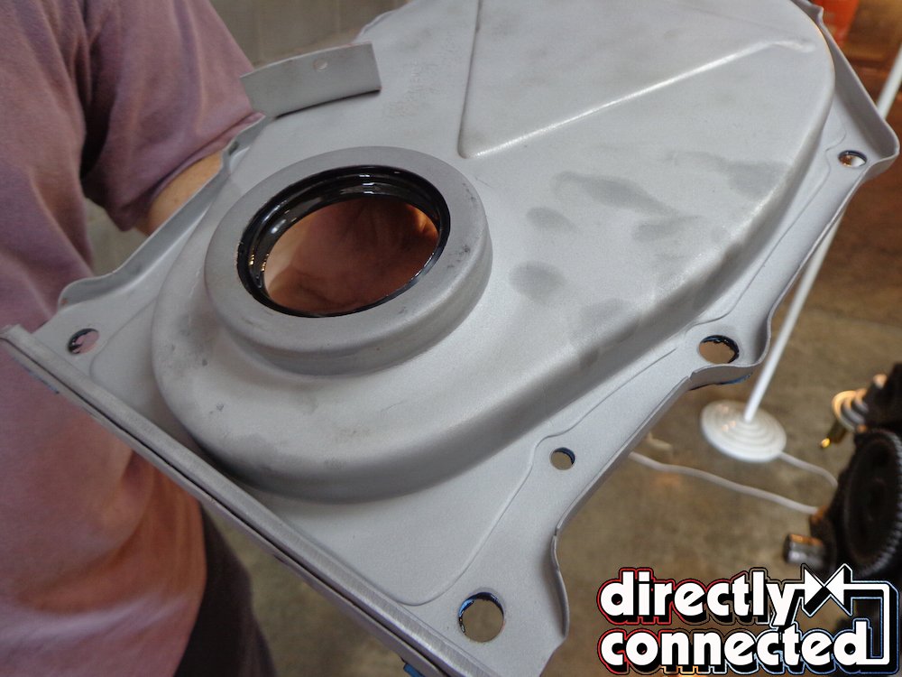 Top left: Next install the timing chain cover. It has a rubber seal mounted in a metal ring. The seal must be tapped into the cover. Again make sure it is in the position shown. Top right: Install the oil slinger. It serves two purposes. One to keep the chain better lubricated and two to keep excessive oil off of the crank seal. Bottom left: Correctly installed seal with gasket and a thin coat of silicone ready to install on the block. Bottom right: As always torque the front bolts to specifications. There are two different size bolts used on the timing chain cover and should be tightened down using the traditional cross-pattern.