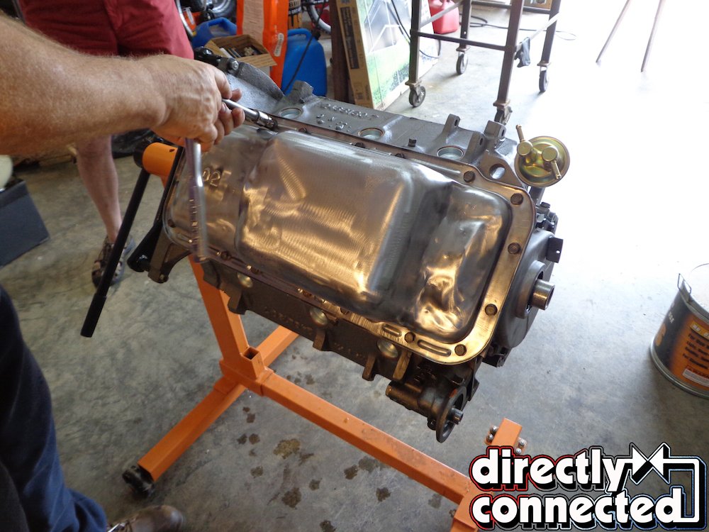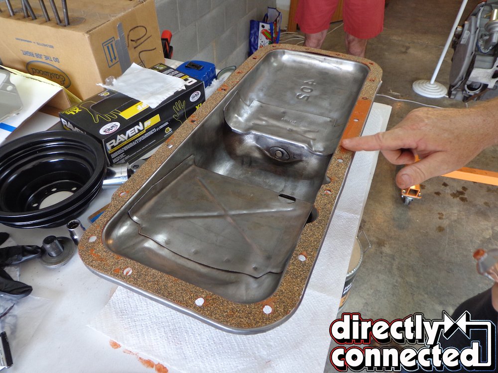 The windage tray and oil pan require two gaskets. Cork gaskets were on this engine originally so use them since they do show after installation. Use Red high temp RTV and spread a light coat on the engine block. Place one gasket in the engine and then coat it with a thin layer of RTV. Place the windage tray next. Coat the oil pan with a layer of RTV and place gasket on pan. Then apply another layer of RTV to the gasket. Place the pan on block. Install pan bolts, note the correct head marking, and snug them all down. Let set for five minutes and tighten each one until you see the gasket start to swell towards the outside of the pan do not tighten any further or you will split the cork gasket.