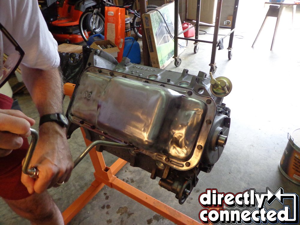 Above left: Install the oil pick up tube. If you are using the original make sure it is completely clean and the screen does not have any blockage. If a new one is used be very careful in starting the tube into the block or you may cross thread the fine threads. The pick up is very stubborn to get it all the way in place. I use a pipe wrench to tighten it. Be careful not to bend of collapse the tube. Above right: Test the tubes height and position by putting the windage tray and the oil pan on and off as you go. The oil tube pick up cannot be flush against the pan bottom or oil starvation will occur. However it only needs about 1/16th of an inch clearance.