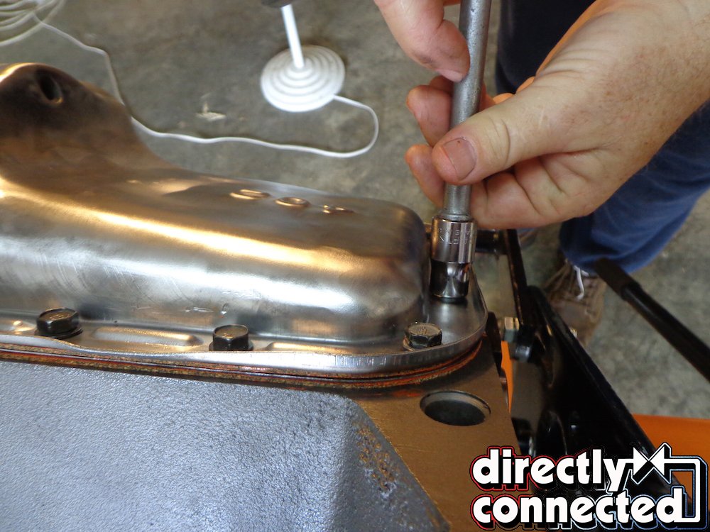 Top left: Here is an original, correct, pan bolt. Notice the self-locking dot about halfway up the threads. Many guys I have talked to have never seen this since most of the time the originals are long gone. Top right: Finger-tighten all of the individual pan bolts down all the way around, making sure the gasket and windage tray all line up. Bottom left: Snug down all of the pan bolts. Bottom right: Then one by one while watching the two cork gaskets tighten the bolts until you see the slightest movement of the gaskets starting to bulge. Do not over tighten the cork or it will split and you will have leaks.