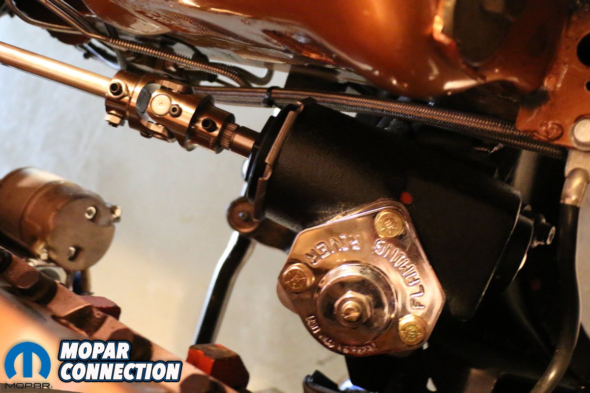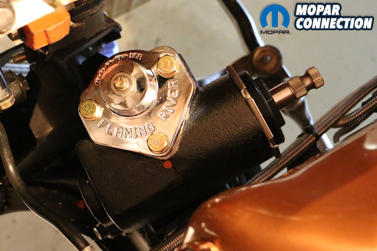 Above: While most won’t like the effort exerted in wrestling the steering wheel around while making slow turns (especially when rolling on tires wider than 5-inches), those looking to shave weight, free up some much needed engine compartment space, and all the while add some improved drivability to their Mopar, Flaming River’s Quick-Ratio Manual Steering box is the way to go.