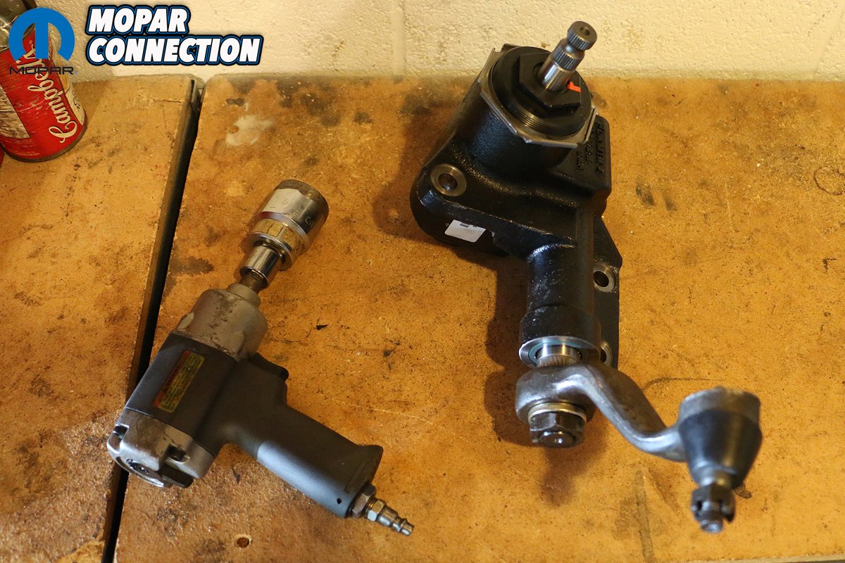 Removal of your factory box begins by punching out the roll pin from your steering’s coupler block. With the pin out, unbolt your column from its underdash and firewall mounts. The coupler should slide off of the 36-spline shaft effortlessly. Use a pickle fork to break the pitman arm’s ball joint free from the center link. Next, the bolts holding down the steering box are 12-point 9/16 and come off easily with the use of an impact.