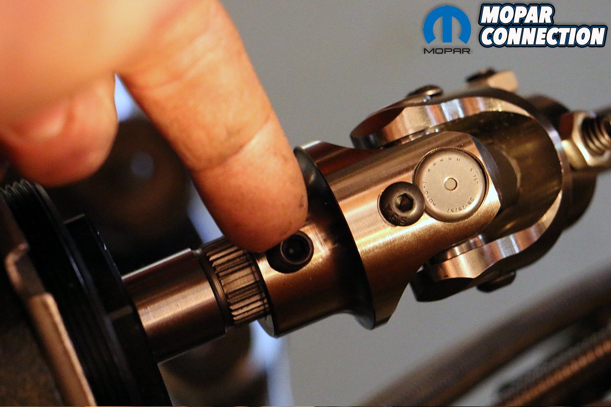 Above left: The universal joint slides in perfectly into the spline’s keyways. Use an Allen to tighten to the spline, and tighten the jamb nuts over the threaded inserts. Above right: For power steering conversions, the Mopar Coupler will mount accordingly. If upgrading from a stock manual box to a Flaming River Quick-Ratio Manual Box, you can use your factory box coupler, the only changing being the box itself.