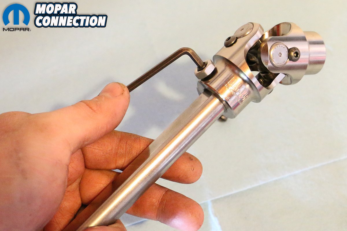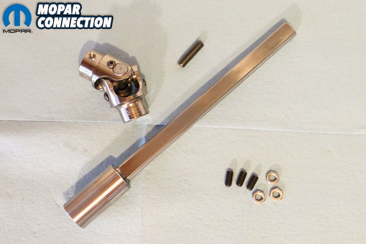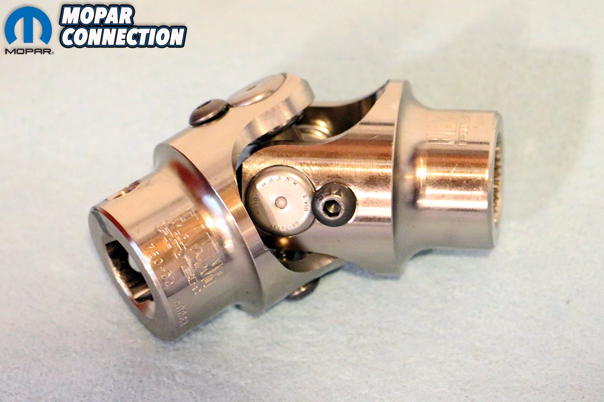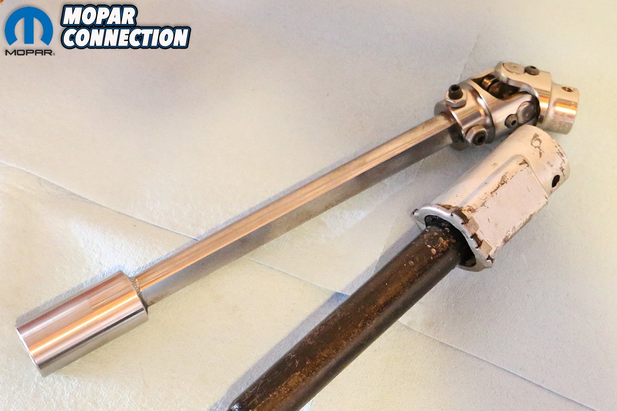 While the Flaming River manual box will perfectly replace an already-equipped manual steering car (the Flaming River unit shares the same ¾-inch input shaft as the Chrysler manual steering boxes), Mopars equipped with power steering boxes have a smaller 5/8-inch diameter shaft, not to mention a shortened steering column. Flaming River’s solution is their Mopar Coupler Shaft Kit (PN FR1505M $197.99) that not only compensates for the shortened column, but provides a superior universal joint coupler. Made from nickel-plated steel alloy, it couples the new box to the new steering column with only minor modification.