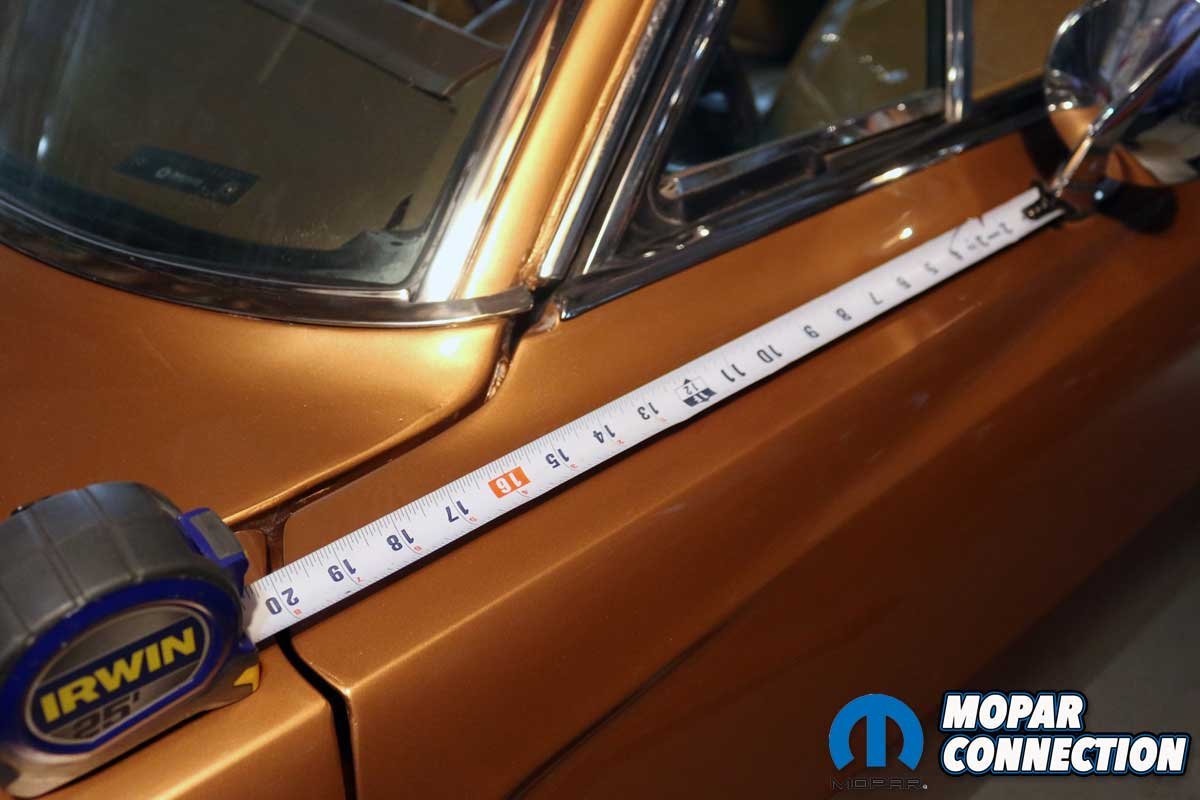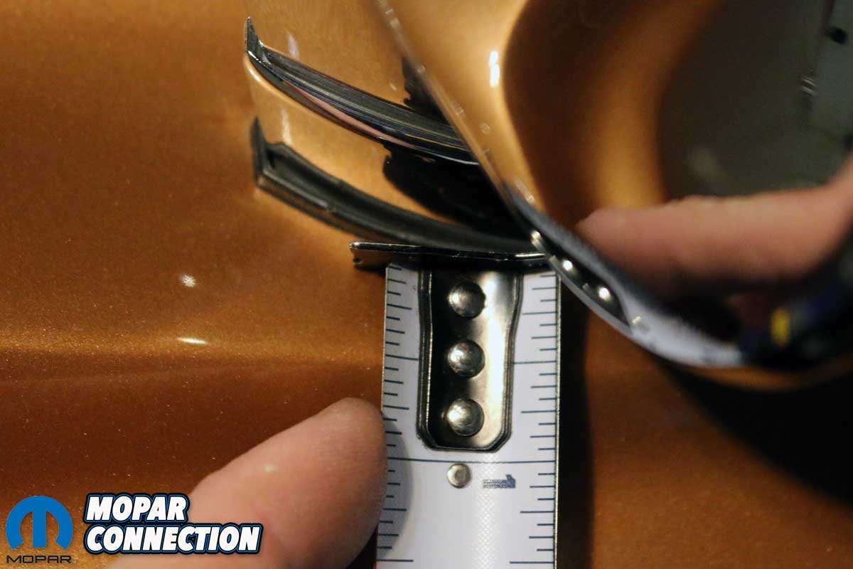With the easy updates completed, we began the mirror installation by taking detailed measurements of the location of the driver’s side mirror. We used reference points of the door’s body line peak and the top of the door at the gap between the door and the fender.