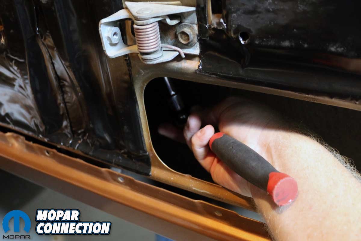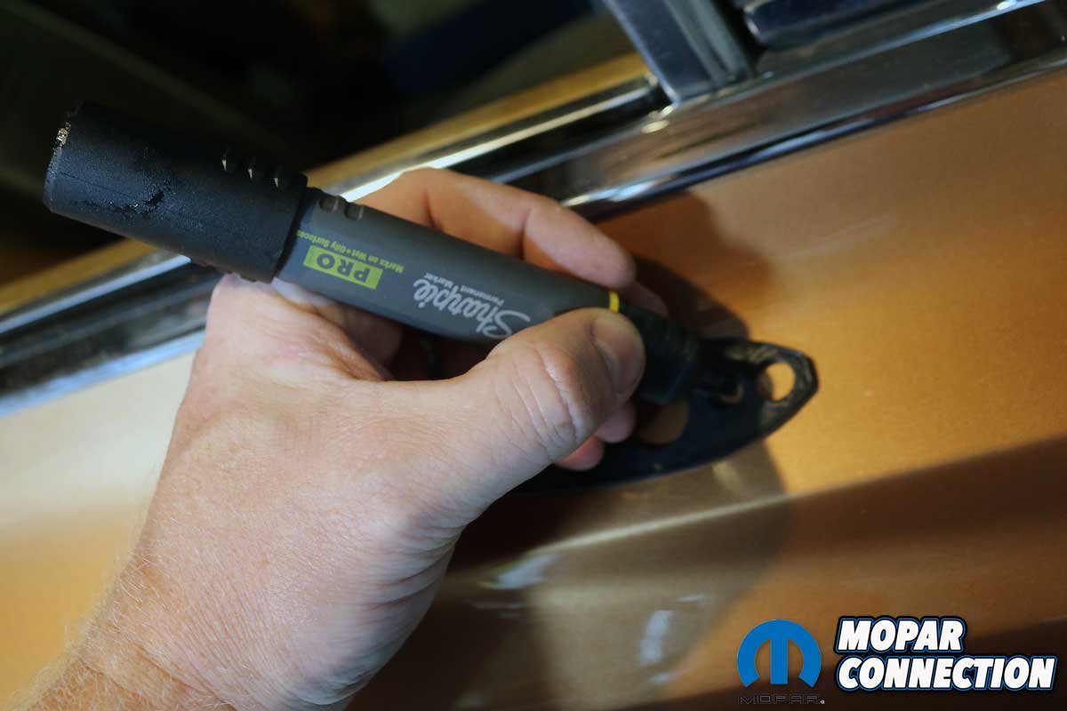 We carefully plotted measurements from the passenger door’s body line and door gap. Next, the mirror gasket was laid on the door at our measured points. The gasket had two provisions which we marked and center punched to accept the mounting screw and stud.