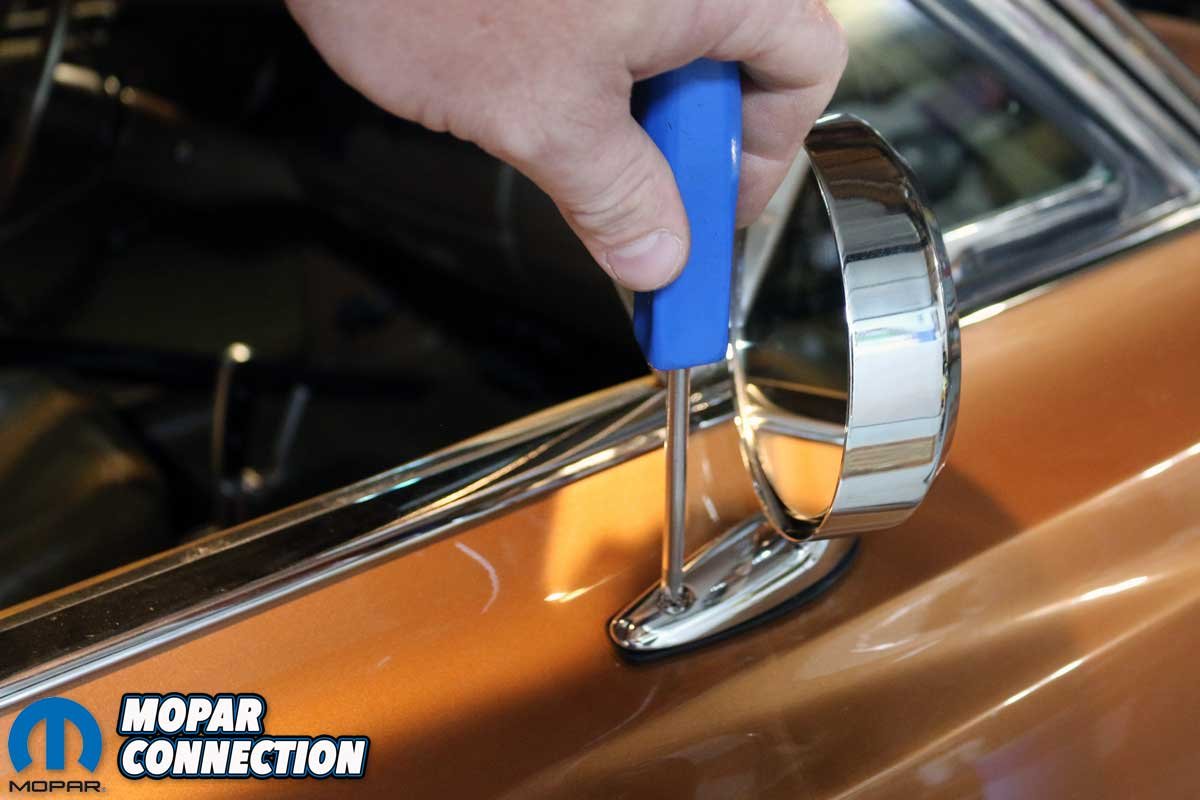 Above: It was rare to see a mirror hanging on the passenger side door of muscle car era Mopars. Brazen did not have a mirror, but with the help of Year One, we picked up one that matched the driver-side mirror.
