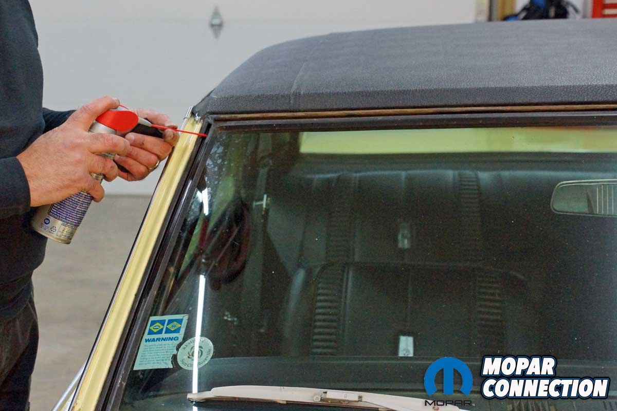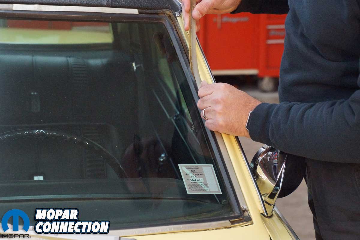 To ease the installation of the lock strip, we lubed the gasket with a dry lubricant. Next, the strip was guided into the gasket channel. After we slipped the lock strip into place, we used our trim tools to locate the gasket onto the strip. We followed the same procedure on the passenger’s side a-pillar strip.