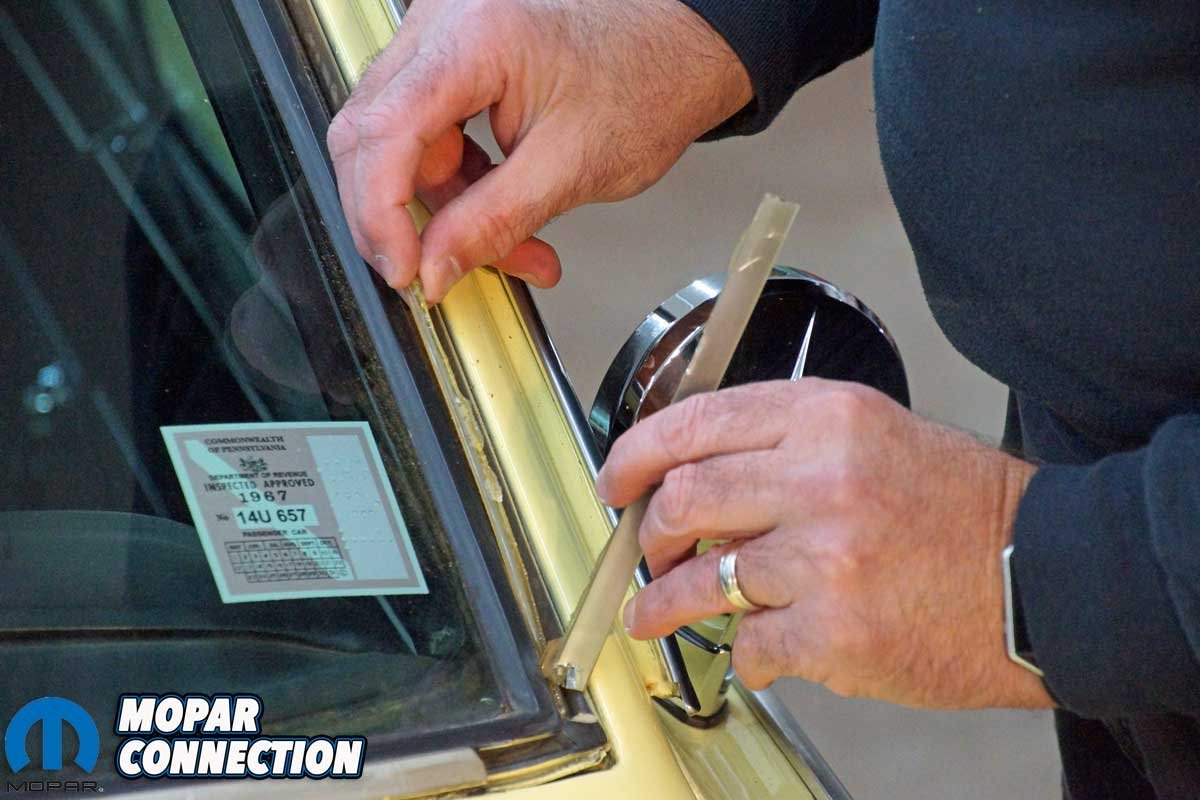 As the trim broke apart, we had to pick out the chunks of lock strip that remained. It turned out to be more work than we had expected. After removing the driver’s side trim, we performed the same procedure on the strips of the top, bottom, and passenger side a-pillar. Once the strips were extracted, we used the cotter pin removal tool and a shop vacuum to free any remaining debris and clear the gasket channels.