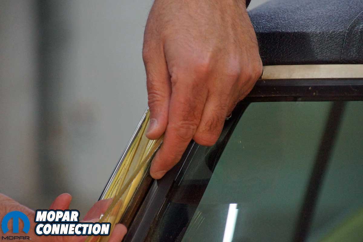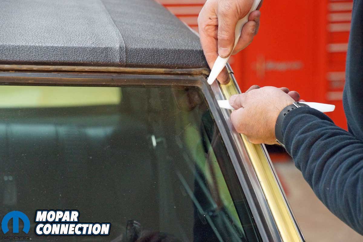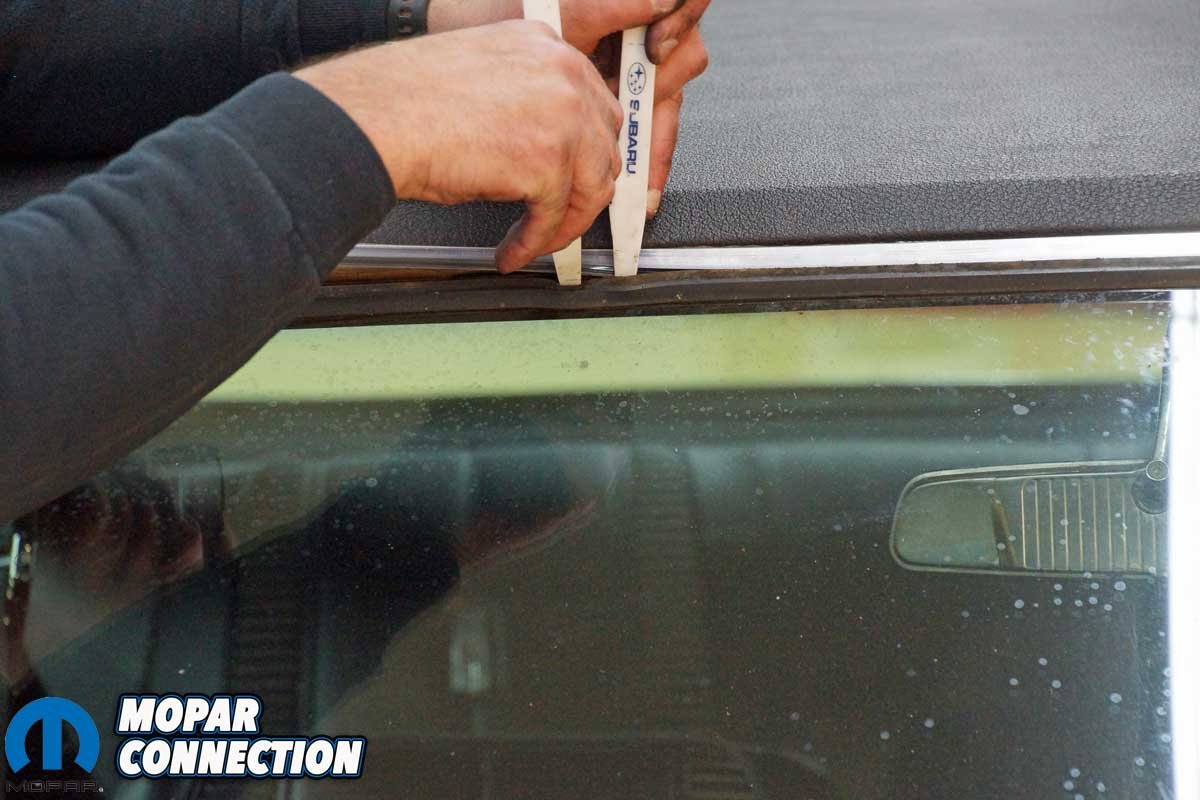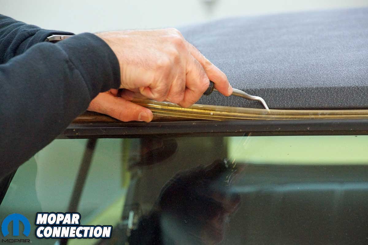 Installing the top lock strip was a similar process as the a-pillar trim. Yet, we could not merely slip the much longer 52-inch strip into the gasket. Therefore, we started by working the lock strip into the gasket by manipulating the gasket with a pair of trim tools. Again, we worked slowly but diligently, and eventually, we had the strip secured in the gasket.