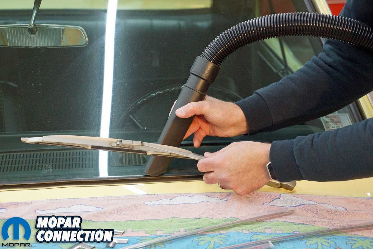 Left: The final lock strip section was removed. We could have pulled the wiper arms, but rather than fight to release them from the Dart, we just worked around them. Right: The gasket was cleaned, and we vacuumed each gasket channel to remove any remaining debris.