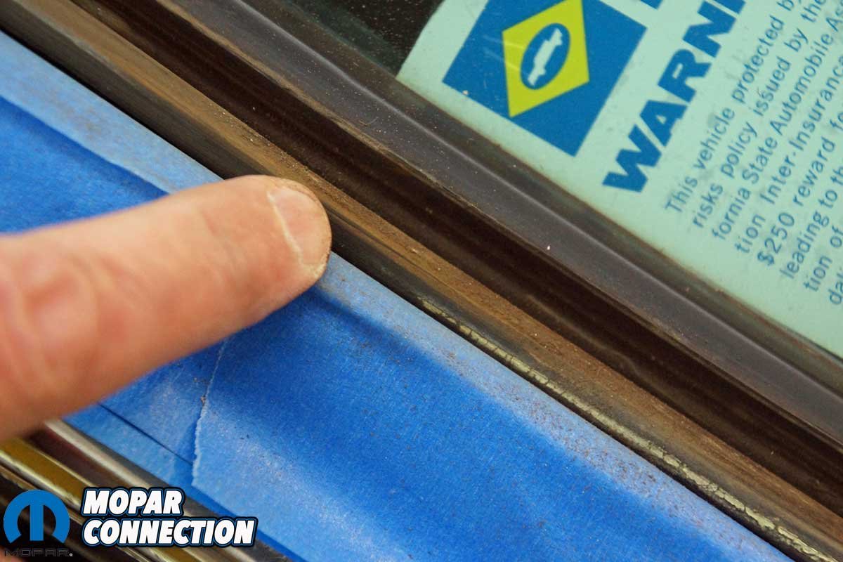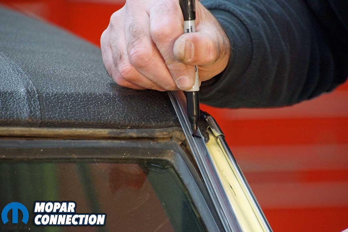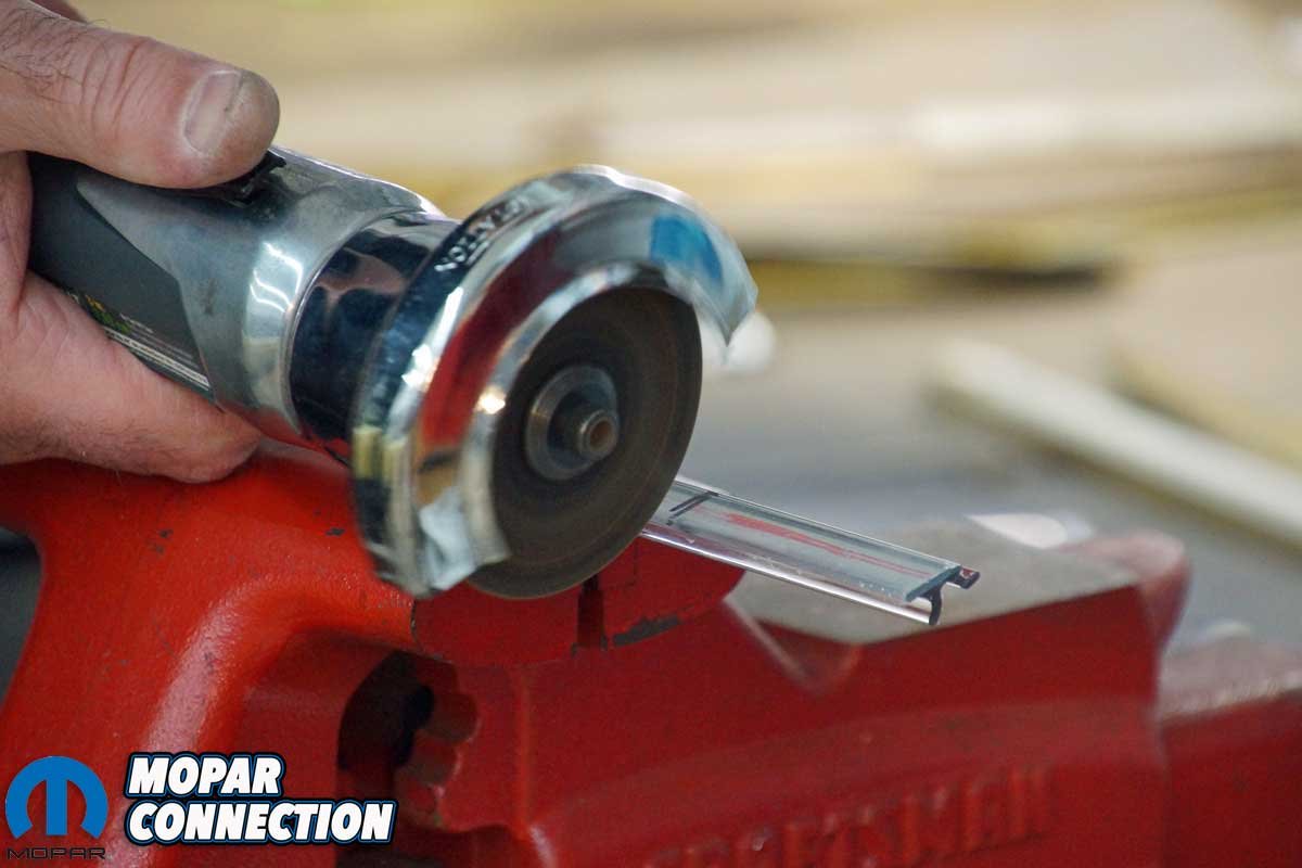 We started the installation of the lock strips on the driver’s side a-pillar. The Classic Industries lock strip kit comes with two 22-inch-, a 52-inch-, and a 62-inch-strip. We selected a 22-inch strip. However, the strip was longer than needed (it could be used on a sedan with a taller roof line). Therefore, we laid the strip on the gasket and marked the length necessary for our Dart. Once marked, we shortened the strip with a cut-off wheel.