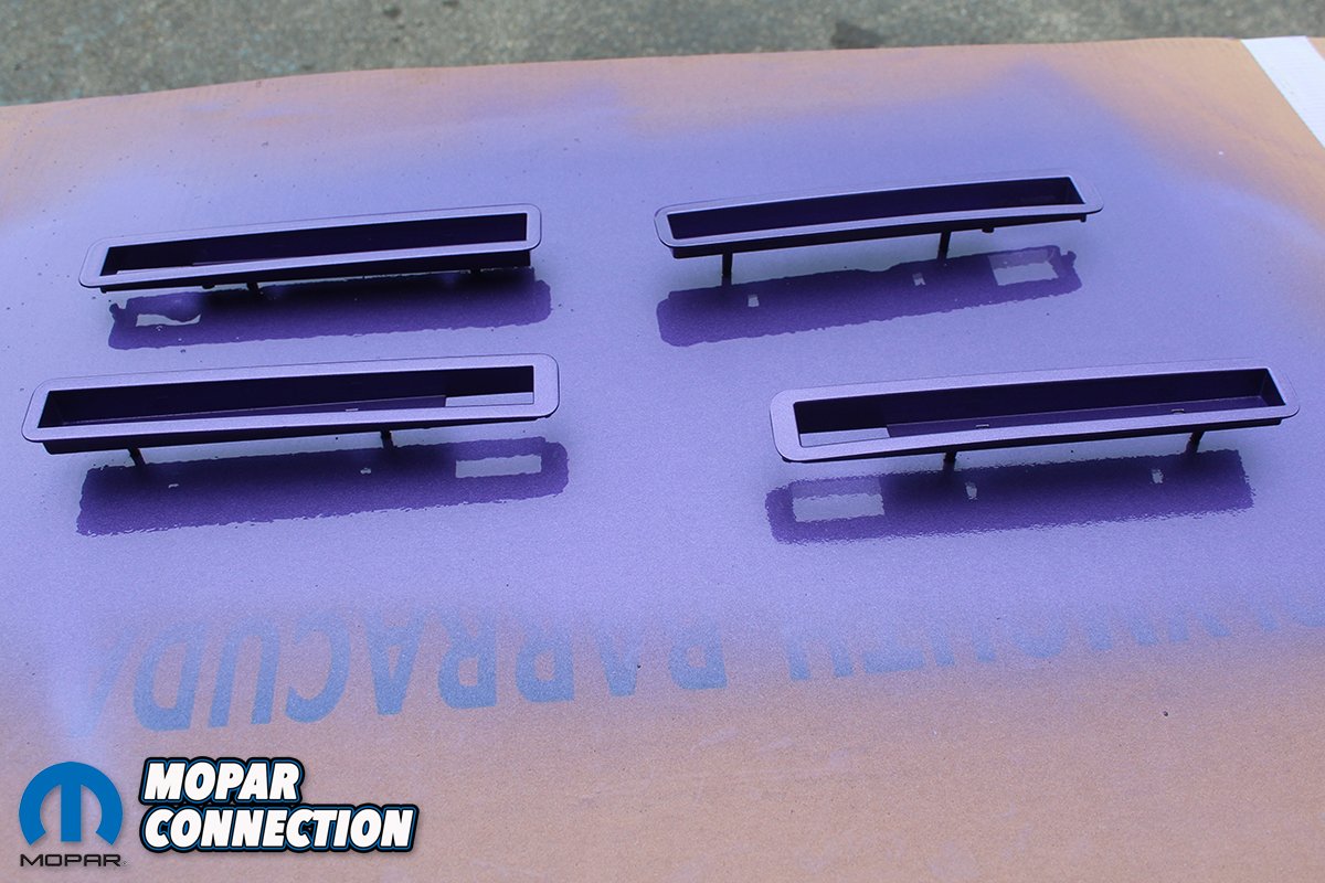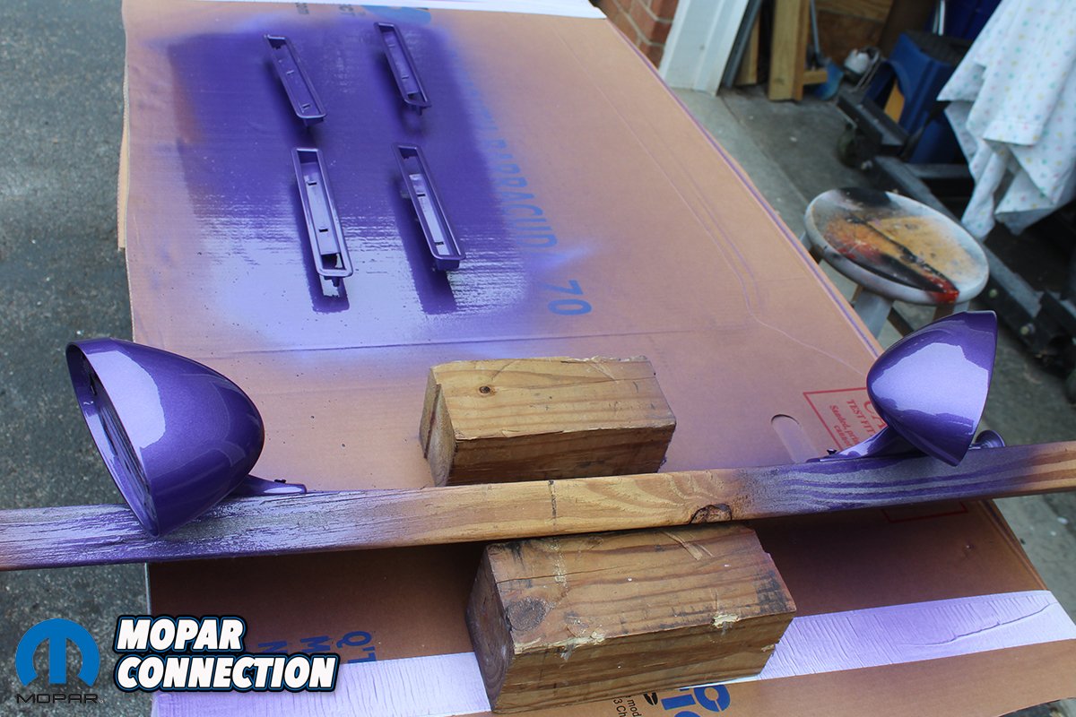 Above left: The first step was to scuff the bezels and then prime and shoot them with body color base followed by clear coat. If you are restoring your originals, you need to strip them and repair any pot marks or scratches in the metal. The front markers are usually in the poorest condition since they were exposed to all the elements from the front suspension, tires, and road trash. The rears usually survived in better condition since they were mounted in the trunk. Above center: While we had the paint mixed, we decided to go ahead and shoot the other miscellaneous parts that needed base and clear. The side mirrors were originally painted off the car and installed on the assembly line. We have seen many mirrors that didn’t match the body color on these cars. But todays restoration standards require that they match in color and finish. Figuring a way to mount these mirrors so we could paint them required some serious back yard engineering. Above right: We just returned from a very large car show, O’Reilly’s World of Wheels in Birmingham, Alabama. We were amazed at how many quality restorations had incorrect latches and attaching hardware. The trunk catch and the attaching bolts were painted on the cars. The hood catch and bolts were also painted body color.