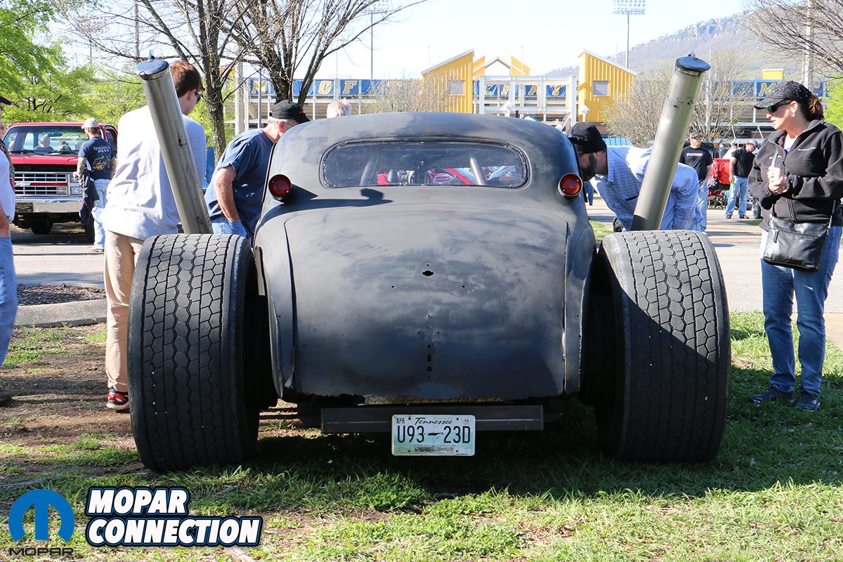 In the shadow of the looming Coker headquarters, a DJ played classic rock tunes, while special giveaways and door prizes were raffled off shortly after lunch. Equally, back by popular demand was the “blemished tire sale”, offering discounted prices on blemished, otherwise unsellable tires. Nearby, the Chattanooga Cruise-In welcomed the Hot Rodders of Tomorrow engine build teams as they battled in a National Qualifying event for its year-long series, hurriedly disassembling and reassembling the engines on the stands before cheering crowds. I spent a fair amount of time socializing with Gray Frederick and Matt Graves from American Powertrain, whose massive trailer was on hand, displaying their different Tremec TKO and Magnum kits for every hot rod and muscle car platform imaginable.