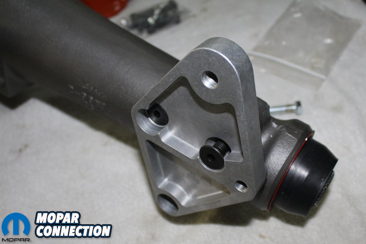 Above left: Detail, detail, detail. The clutch/throw out bearing arm was attached to the bell housing before it was painted. So, it will have overspray engine color. Above center: The clutch arm boot is installed after paint so it is natural. The boot is complete with the detailed Pentastar and part number. Above right: The correct shifter mounting plate and bolts are provided. The rear perch is correct for the 1970 E-body application.