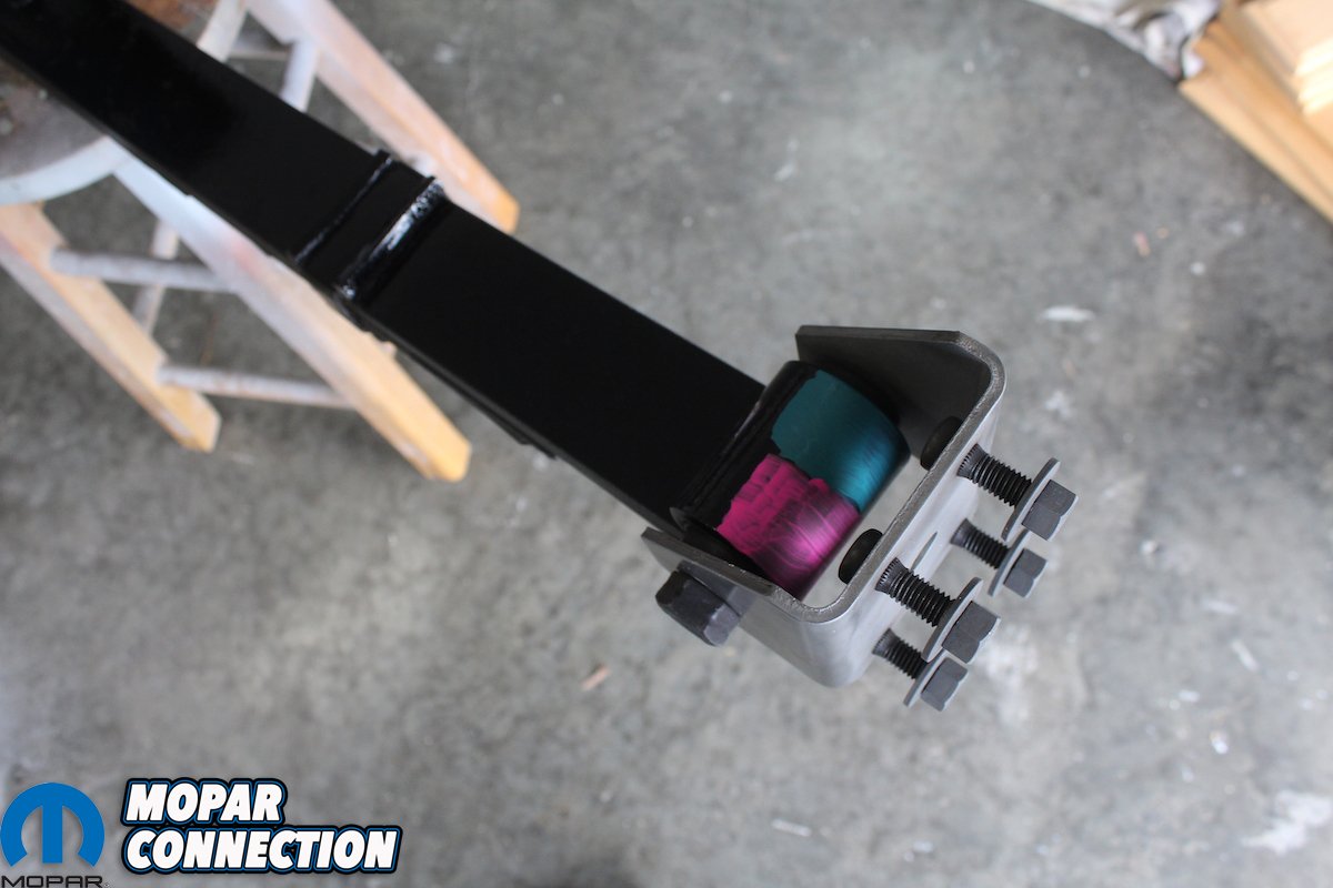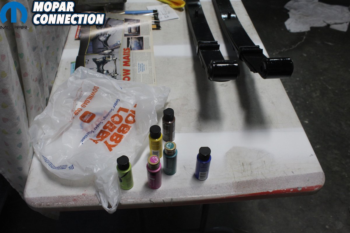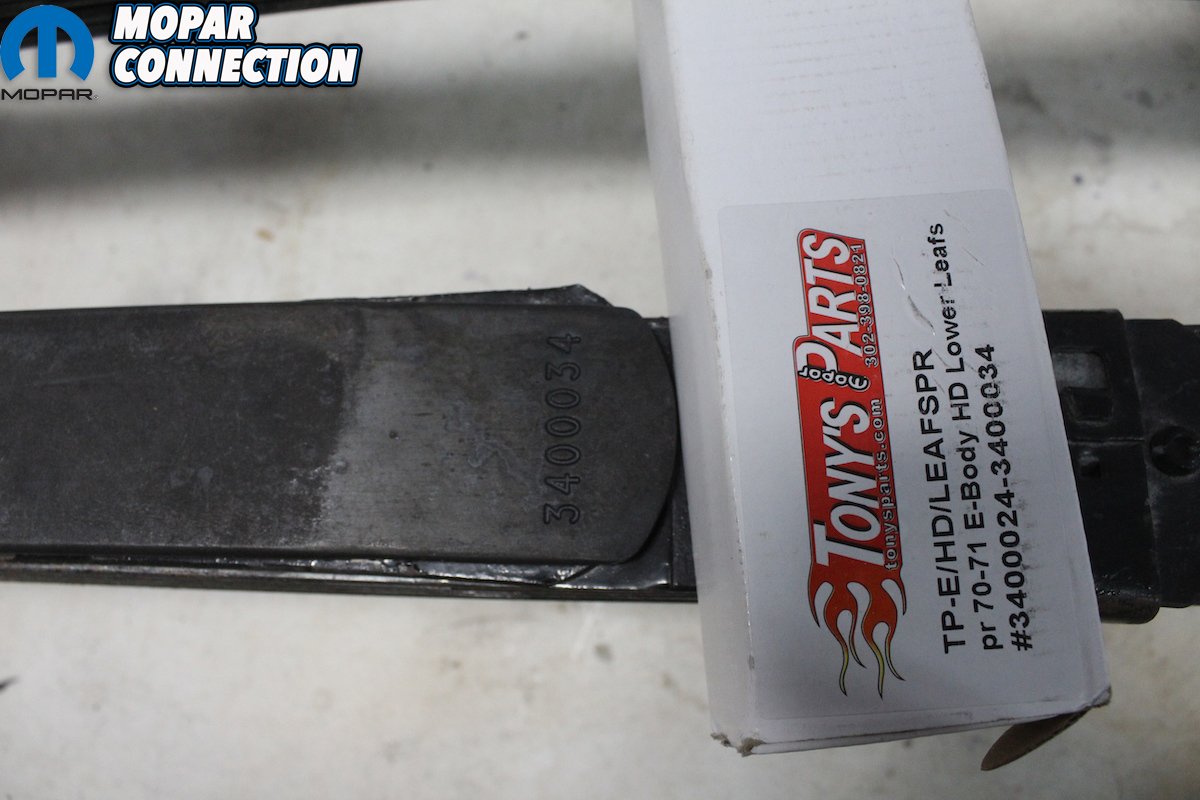 Above left: Using the paint, we purchased from the hobby store, we mark the front of the passenger side spring with two one inch stripes, on the front of the spring eye. These two stripes are pink and turquoise and yes it matters which one goes to the outside and which one goes to the inside. Above right: The driver’s side spring has a brown and beige stripe while the passenger side has the pink and turquoise stripe. There are different color stripes on B-bodies, A-bodies, and E-bodies. Make sure you do your research as to what your car came with.