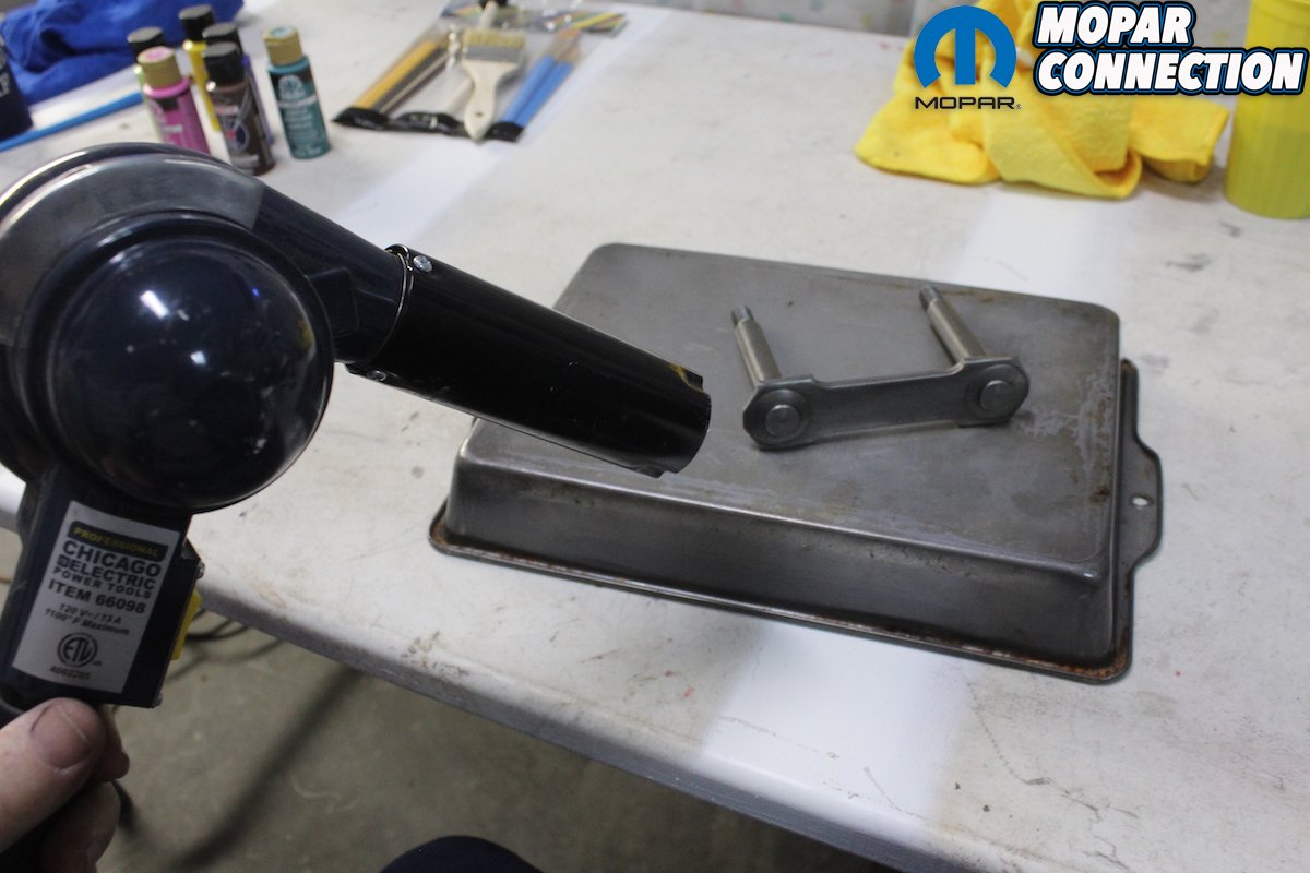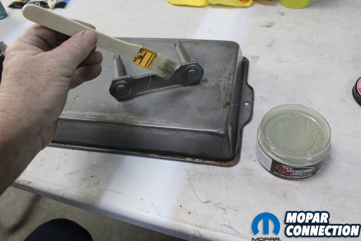 Above left: The Rust Preventative Magic (RPM) from ECS is a great product. It is the only way I know to keep natural metal natural and rust free without painting. Make sure your have the parts completely clean and rust free before treating. You take the brush provided with the RPM and liberally brush it on the part. Above center: You then take a heat gun and heat the part until the paste dissolves and flows over the part. After it cools you take a clean cloth and wipe the excess off the part. Above right: Some people have said that the shock mount plates are painted semi-gloss black but on 1970 E-bodies they are for sure natural. We use the RPM on these too.