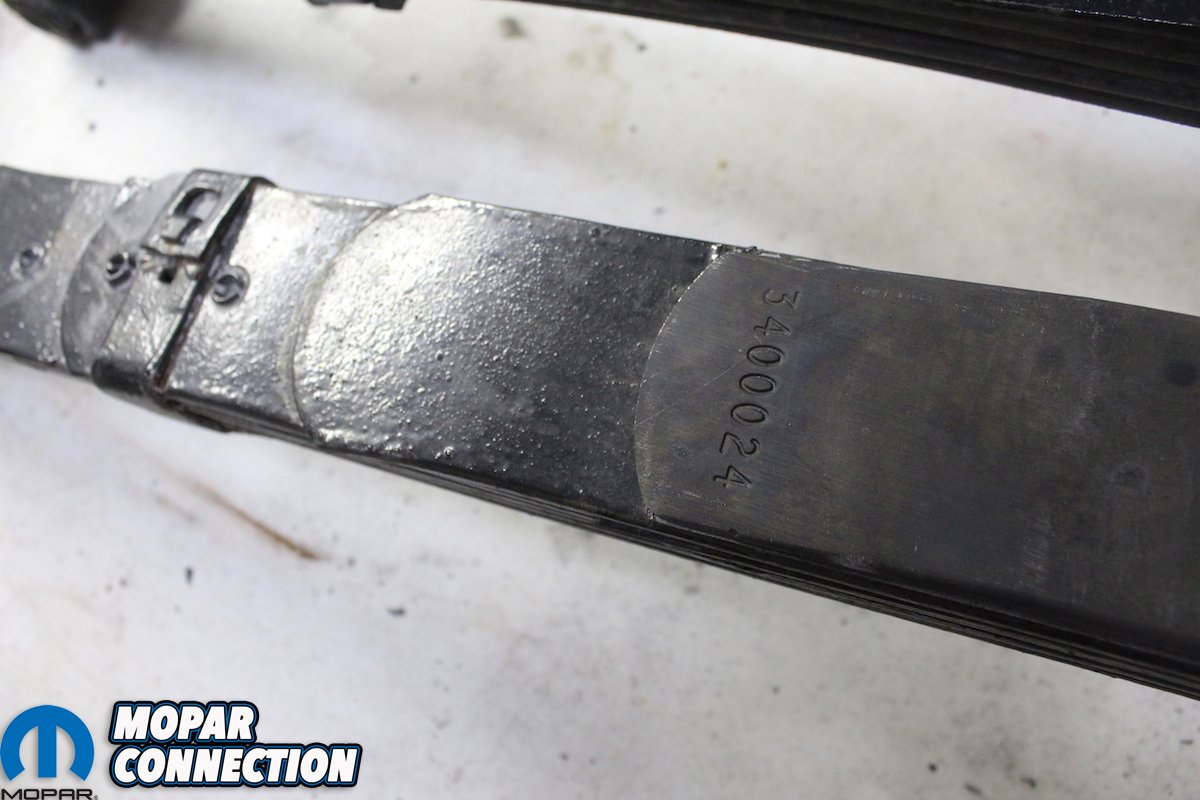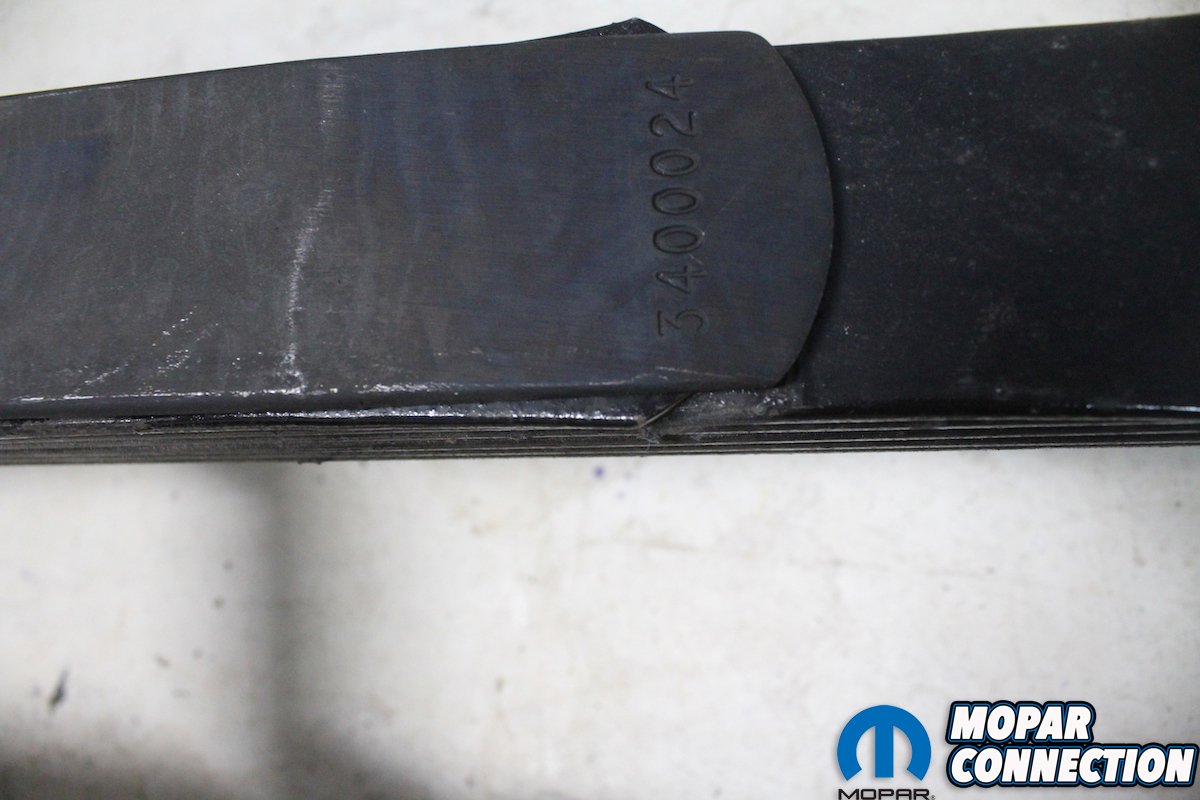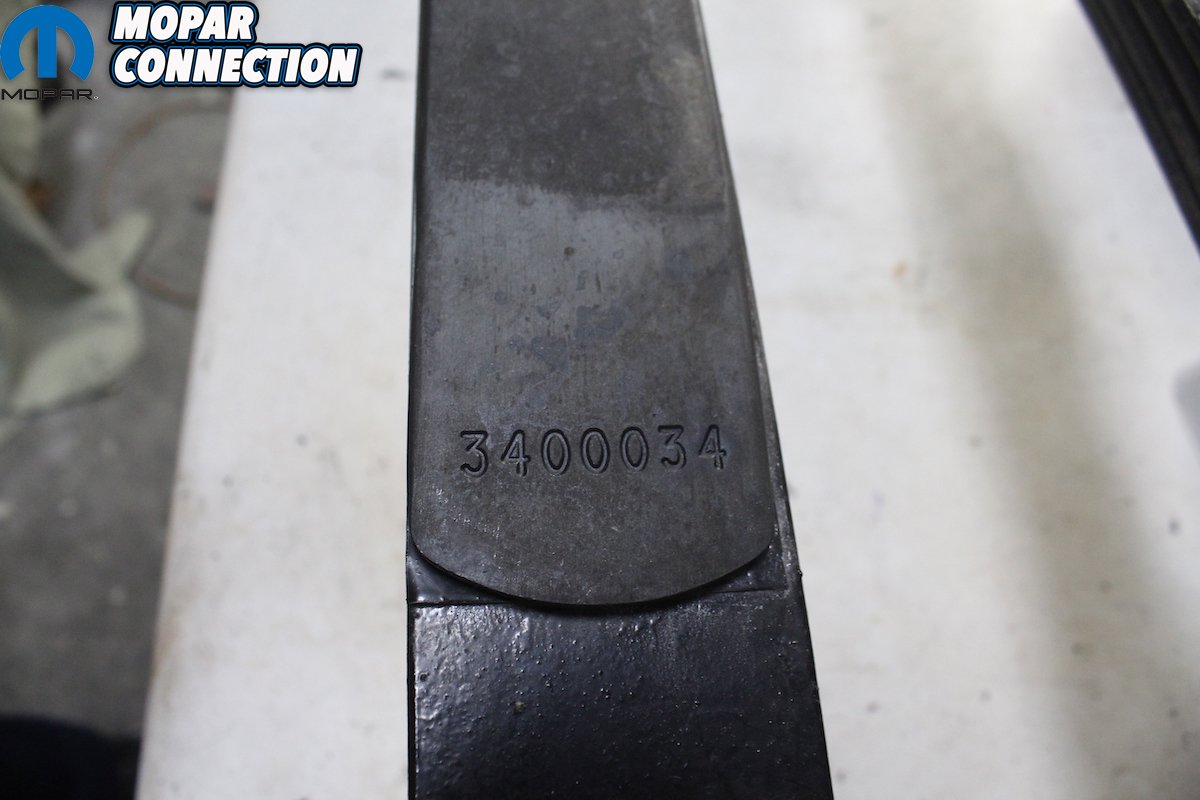 Above left: Upon inspection of the leaf springs we found that the lower leaf on both sides had the wrong part number. They were the correct HD springs and had been rebuilt but we needed correct parts numbers. Tony’s parts have reproduced these lower leaves and they are great! Above right: 3400024 is the number stamped into this leaf. They are crisp and clean and the correct fonts. Just what we needed.