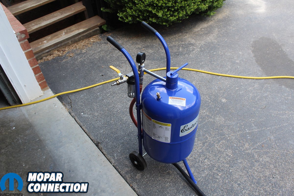 Above left: We stripped the rear end or at least all the parts we could strip by hand. After hours of working on the rear end by hand we gave up and decided to bring out the big guns. Above right: Eastwood has several different sizes of sand blasters. They have enclosed cabinets and these external units. I must say they really work well and are not that expensive. They can use different types of media without any problems.