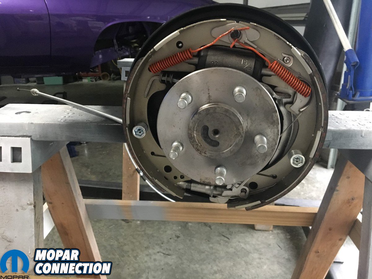 Above left: We shot the entire Dana in semi-gloss black. Later after it all dries, we will remove the filler plug and clean it since it is natural metal. We will also add any inspection marks. Above right: We installed all new brakes, paying special attention to original details like color of springs, brake shoes and hardware. We also went ahead and install the new emergency brake cables we got through YearOne. These parts are better then new but completely original in appearance.