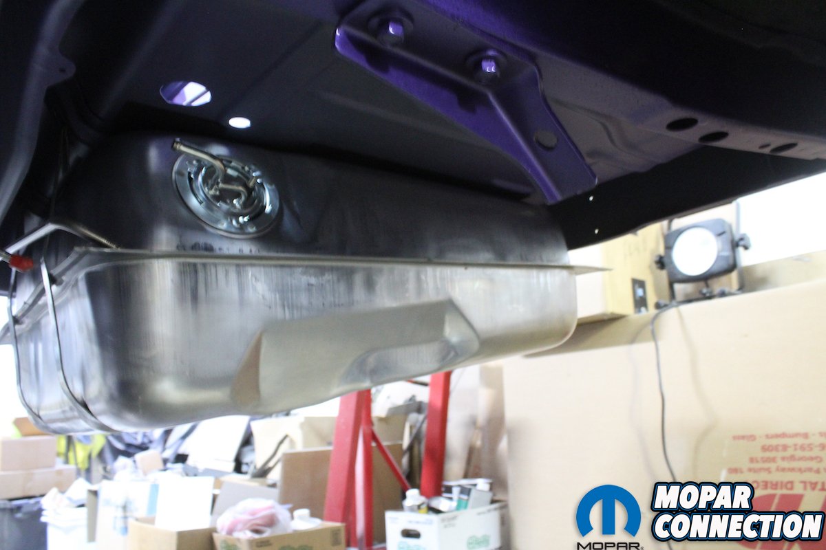 Above left: Before we install the rear end, we get the gas tank in the car. We have a new insulation pad from our friends over at Detroit Muscle Technologies. We only recommend using the “Spectra” brand gas tank. It has the true original finish without any paint on it. Other tanks are just not original in appearance. Above center: By hanging the tank straps from the body of the car the tank is easily slid into place. We used spray glue to install the tank pad that way it will stay in correct position during installation. Once the tank is in place, we already have all the vent and fuel lines installed on the car, so it is easy to complete the tank installation by using the “KV” marked rubber fuel line and correct clamps we got from Badalson. Above right: Here you can see the transportation hooks that are attached to the frame. We used these to secure the car to and from the paint booth. Before installing the rear end, we will remove and refinish these in the correct color. The hooks were natural metal and the bolts are black phosphate. Not all cars will have these since they were used to transport the car from the factory to the dealer. Then the dealers were supposed to remove them, but we have seen many cars with them still attached.