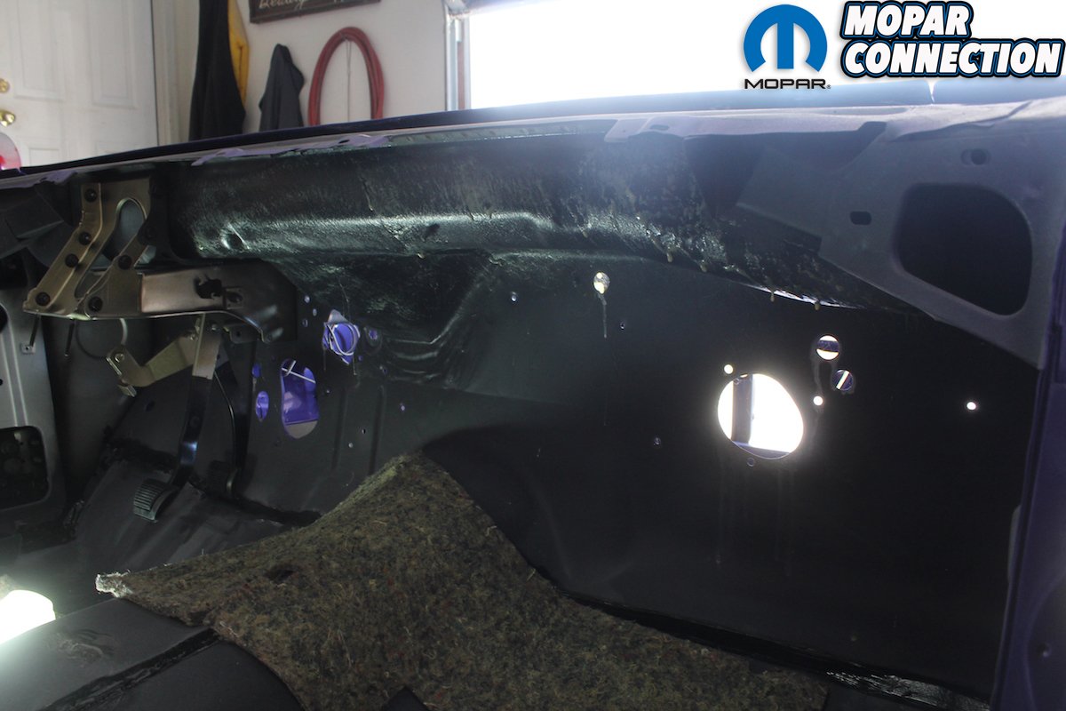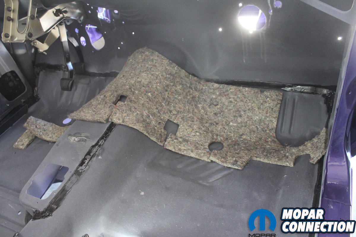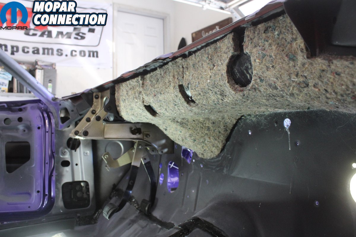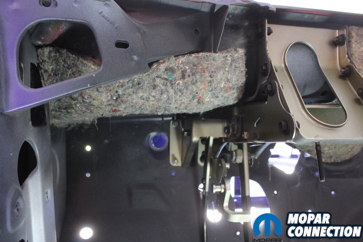 Above: Our good friends over at Detroit Muscle Technologies provided us with all of our insulation and gaskets for the ”Comeback ‘Cuda.” The next step in the restoration process is to install the under dash insulation. The “Shoddy Pad” sound deadener is a dead on replication of the original soft insulation found on these E-bodies.