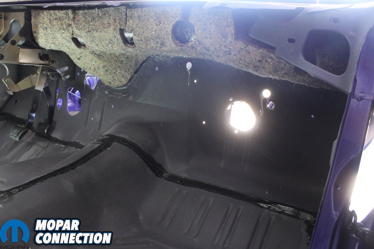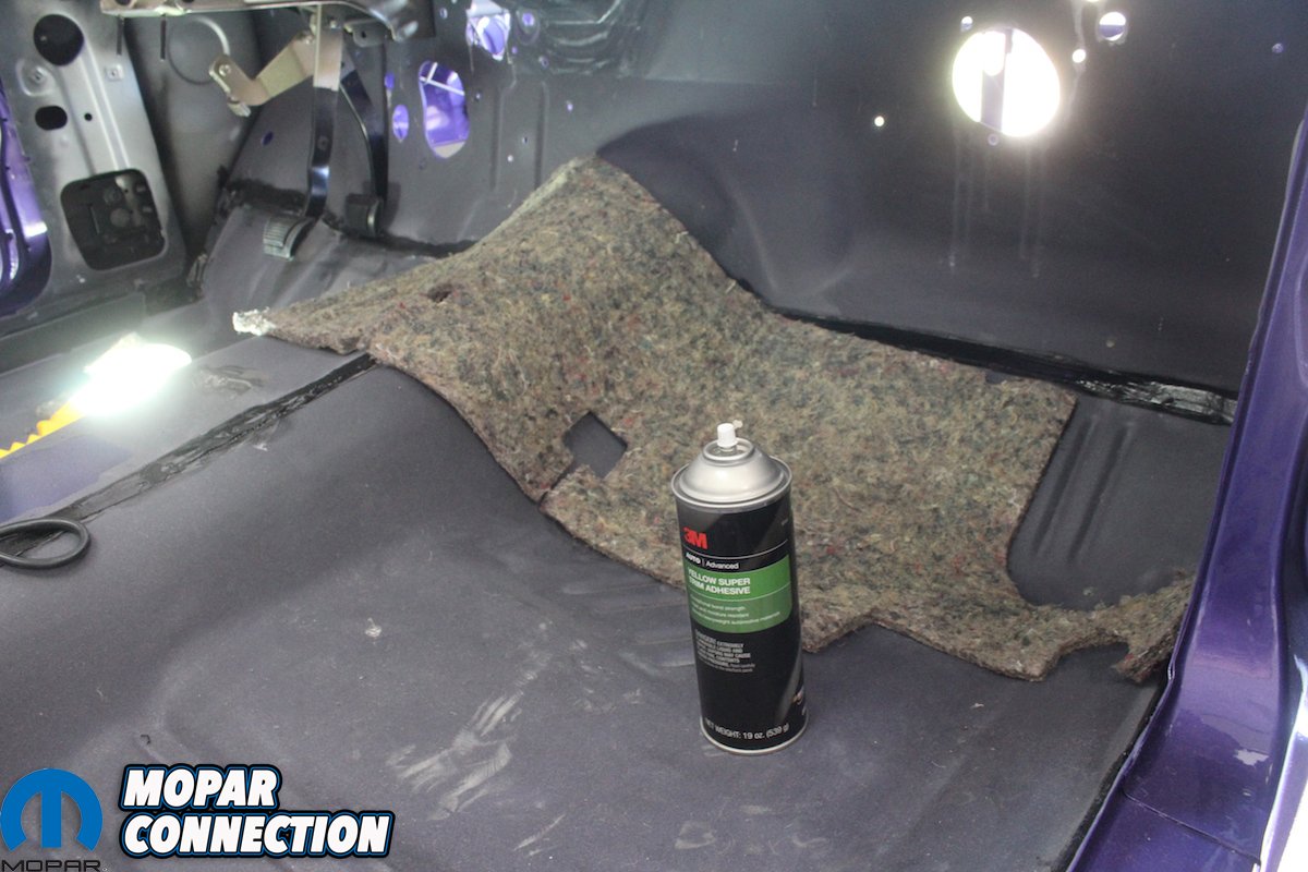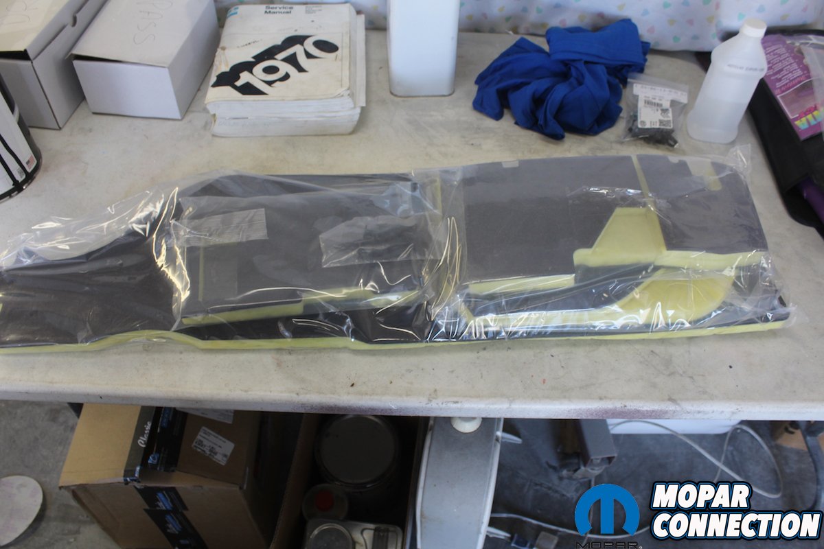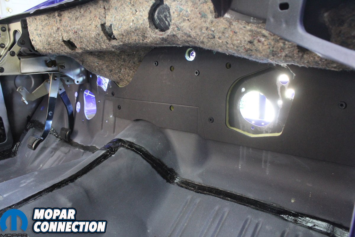 Above: Our good friends over at Detroit Muscle Technologies provided us with all of our insulation and gaskets for the ”Comeback ‘Cuda.” The next step in the restoration process is to install the under dash insulation. The “Shoddy Pad” sound deadener is a dead on replication of the original soft insulation found on these E-bodies.