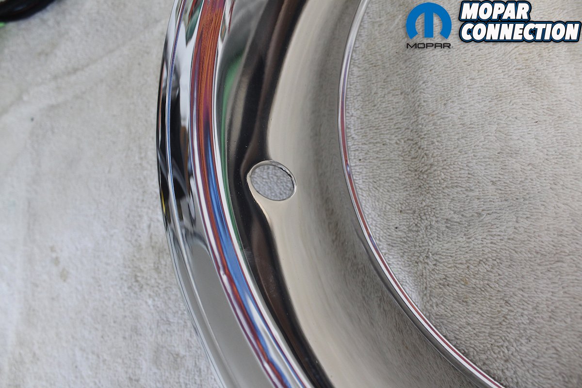 Above left: Here is the Rallye wheel with an aftermarket 15-inch trim ring. As you can see it is not deep enough and leaves a gap between the ring and the wheel. It also has an oval hole for the valve stem. The valve stem extension is present, but the tire is also the incorrect size. This might not be noticed by many people, but it is incorrect. Above right: Off we go on a hunt to find a set of correct polished trim rings. These are not cheap and are all over the board price wise. We were fortunate enough to find a set of five for sale at a decent price. We then had them straightened and polished by our stainless – steel wizard. Notice the correct round valve stem hole.