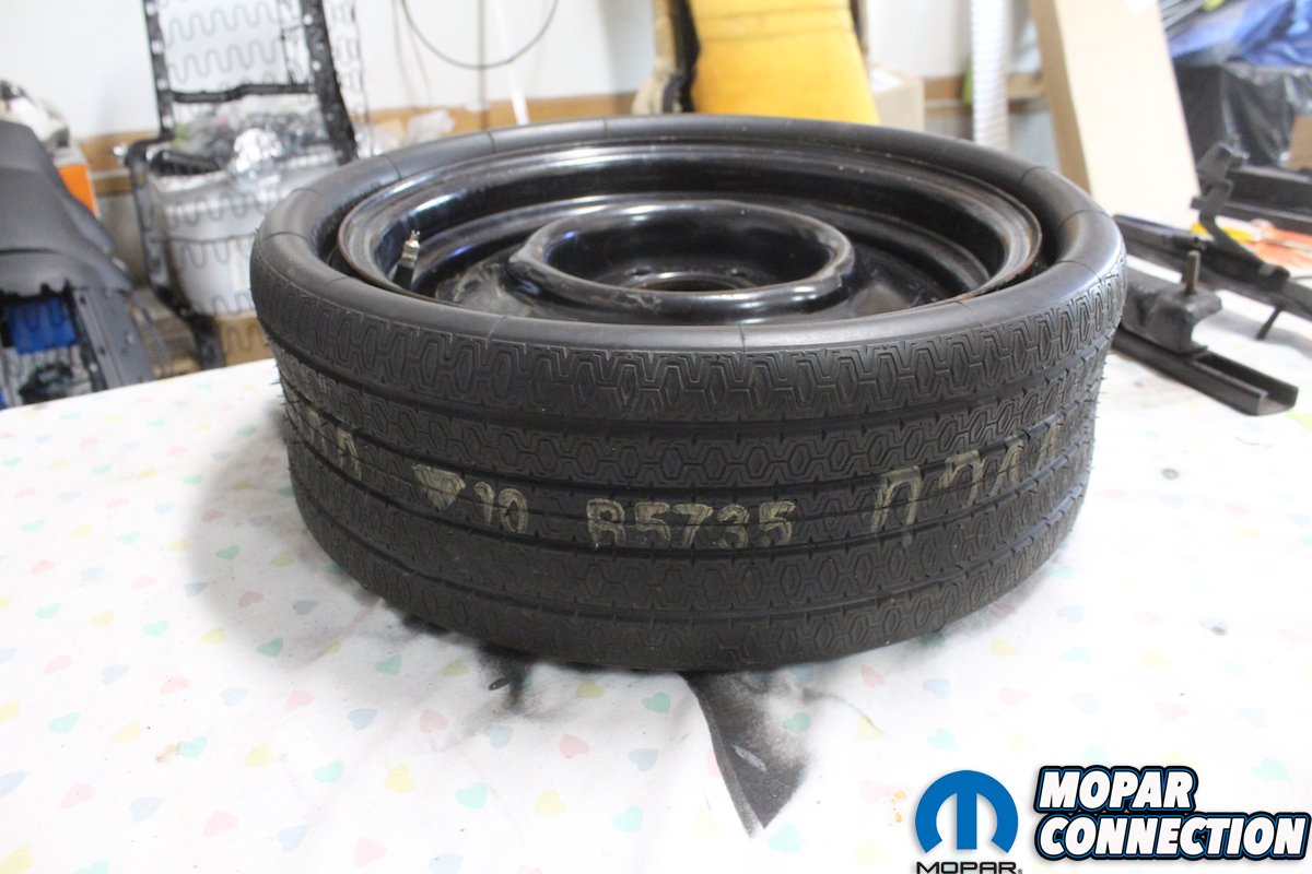 We got out the tires we received from one of our sponsors at Classic Industries, the wheels we bought from Coker, and while we are there, we restored the “space saver” spare tire. Once the car was rolling, we then broke out the complete and correct Hemi exhaust system from ECS.