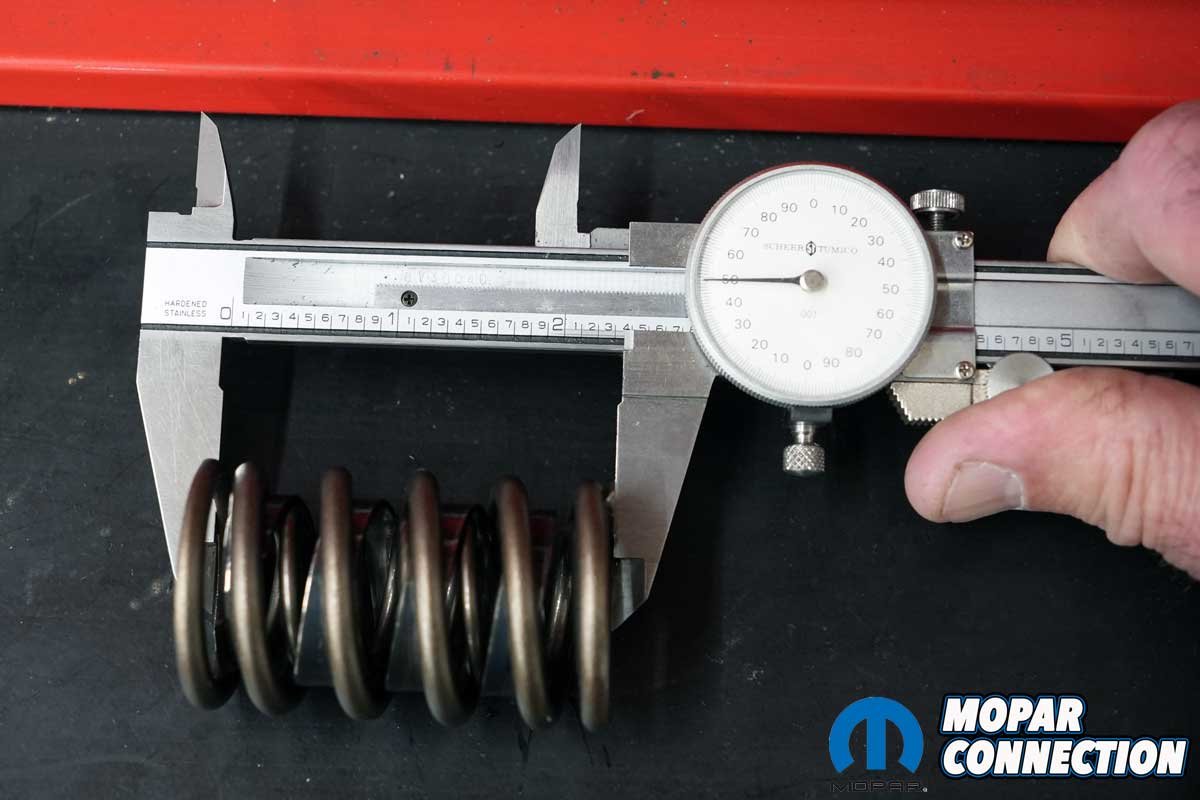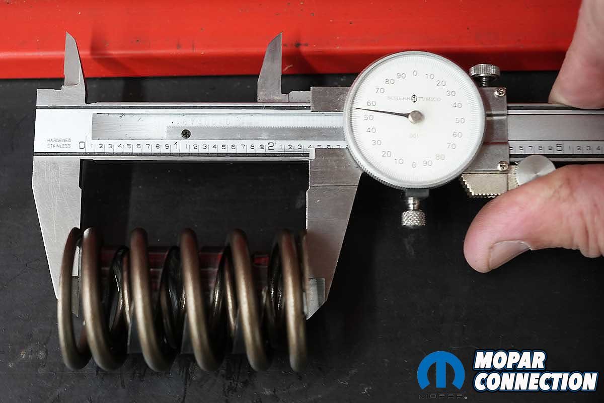 The first measurement was the spring-free length. It involved arranging the springs in a row, separating the intake springs from the exhaust springs if they differed, and measuring each spring with a vernier caliper. The spring was not used if it varied by more than .025 inches.
