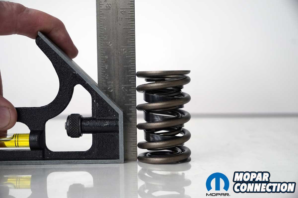 Above Left: The shortest valve spring measured 2.350 inches. Above Center: The longest valve spring measured 2.355 inches. All sixteen springs passed the height evaluation. Above Right: Each spring was checked for straightness with a square, and, again, they all passed.