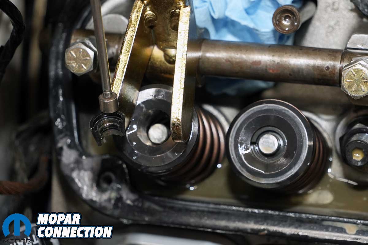 Before installing the valve spring compressor tool shaft, I removed the exhaust valve push rod (for tool clearance), installed a moveable hinged foot onto the tool shaft, and aligned it over the exhaust valve spring retainer. With the handle slipped onto the hinged foot, I pulled down on it, and the spring under the retainer was compressed. The valve remained seated, and the retainer keepers were pulled from the valve stem with a magnet.