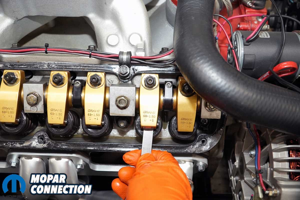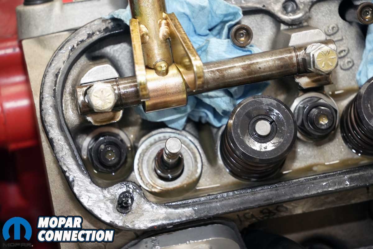 Above Left: The rocker assembly was reinstalled after replacing each valve spring. The five fasteners were tightened a little until each was snug. At that point, I torqued the bolts down in a center-out fashion. The torque was performed in three increments (10-, 20-, and 25-ft-lbs.) Above Right: With the shaft torqued in place, I lashed the valves to ensure they were adjusted correctly. Lashing the valves (engine cold) is also part of the weekly maintenance during race season. I use .028 inches on the intake and .032 inches on the exhaust.