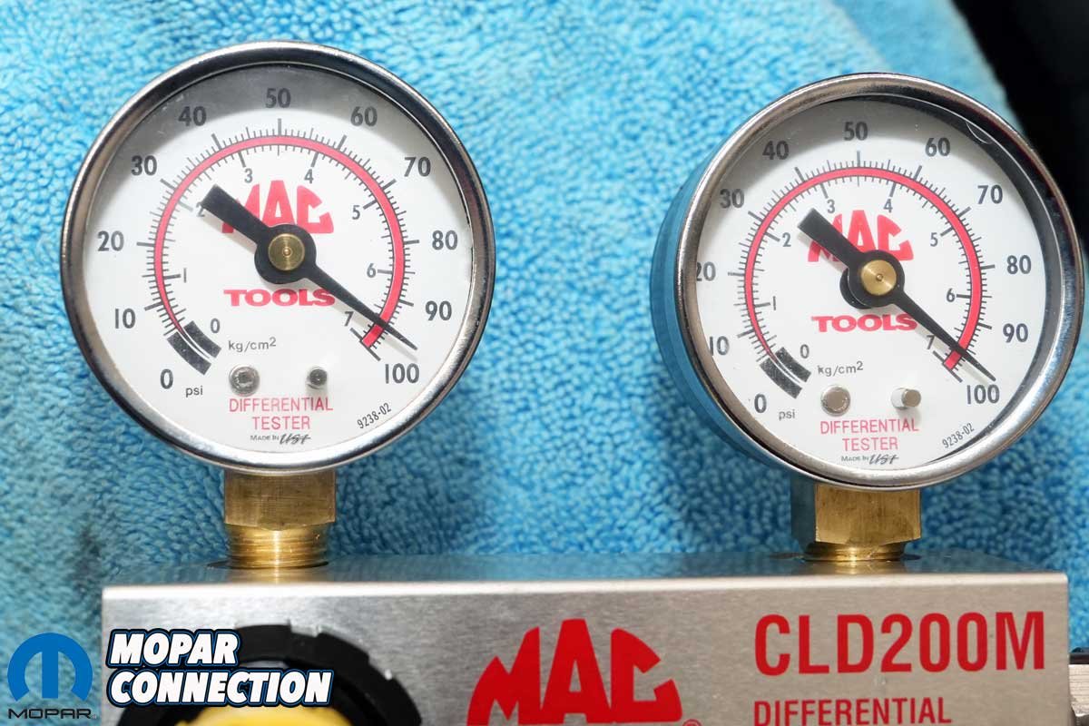 Above Left: Under each spring was a .015-inch hardened steel shim. The shims are used to fine-tune spring pressures. They come in .015-, .030-, .060-inch thicknesses depending on the needs of the spring. Above Right: The leak tester maintained the cylinder pressure to keep the valves closed during the spring swap. Interestingly, this cylinder has about two percent leakage in a cold engine.