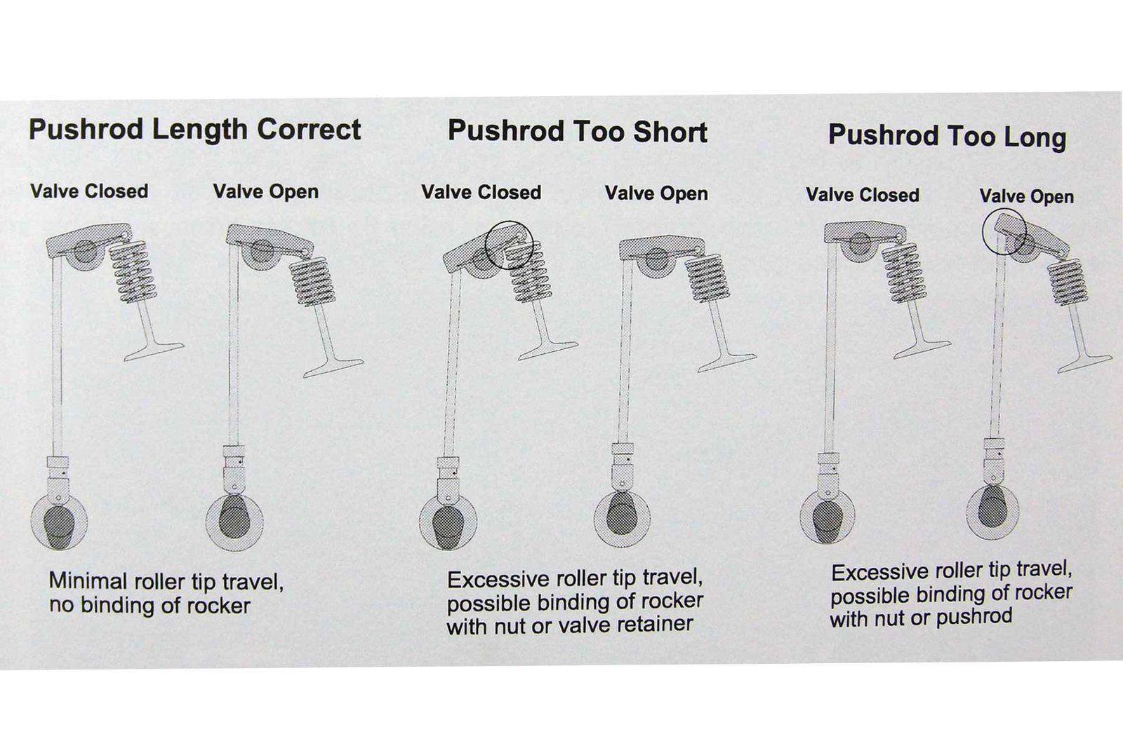 The rocker arm tip travels in an arc, and if the pushrod length is incorrect, the rocker arm tip will be incorrectly placed on the valve stem. If the pushrod is too short, it puts the rocker arm on the inboard side of the valve tip. If the pushrod is too long, it will place the rocker arm tip too far outboard on the valve tip.