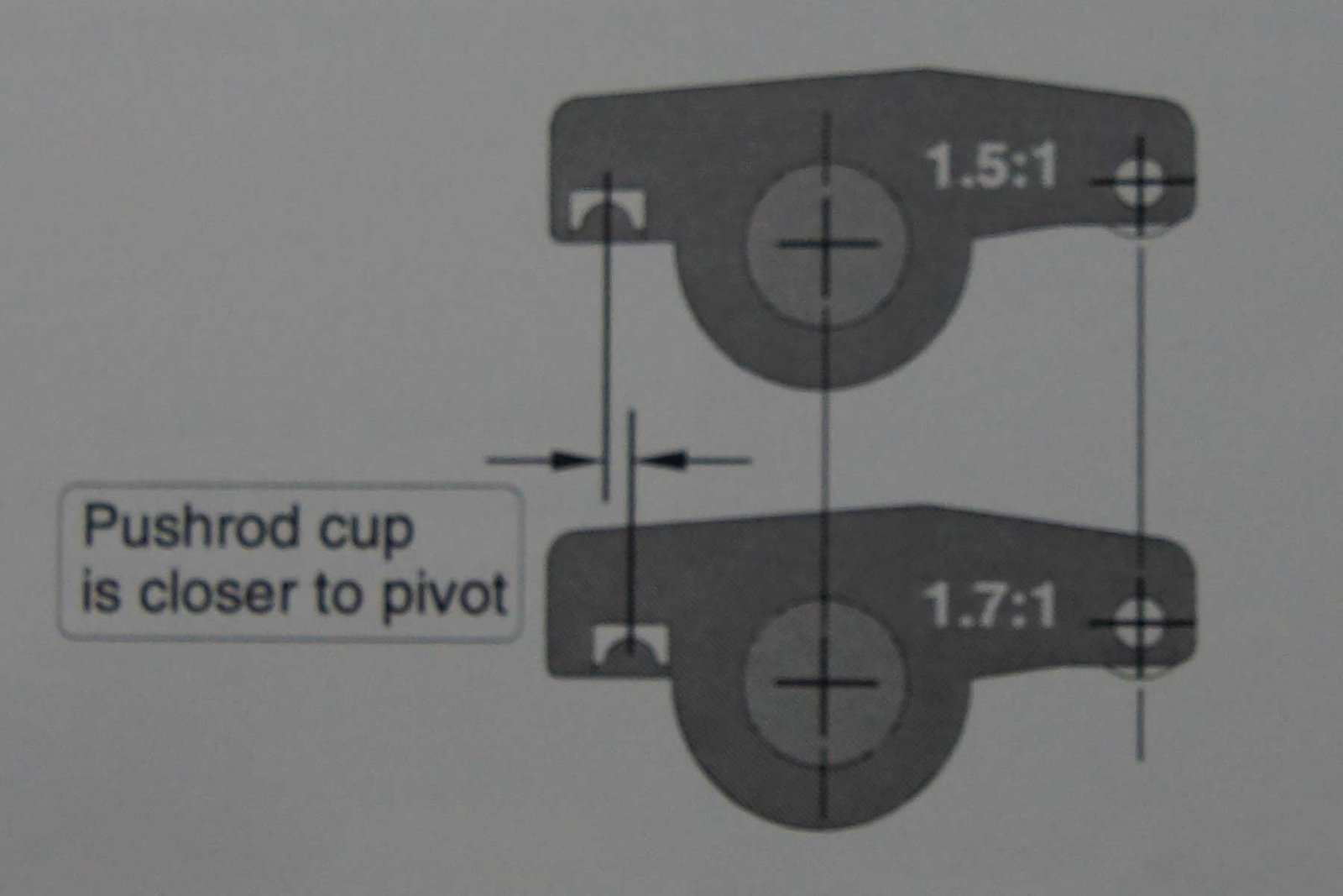 The rocker arm ratio is defined as the length of the valve side to the center or pivot point of the rocker arm divided by the length of the pushrod side to the center. The valve side is usually longer than the pushrod side, which determines the ratio. The ratios range from 1.45:1 to 1.80:1 (sometimes as great as 2.0:1), which means a 0.300-inch lift cam lobe will result in a 0.450-inch valve lift with 1.5 rockers. However, the valve lift will increase to 0.480-inches with 1.6 rocker arms.